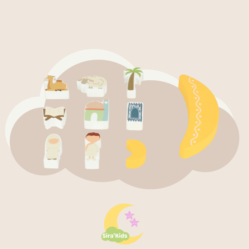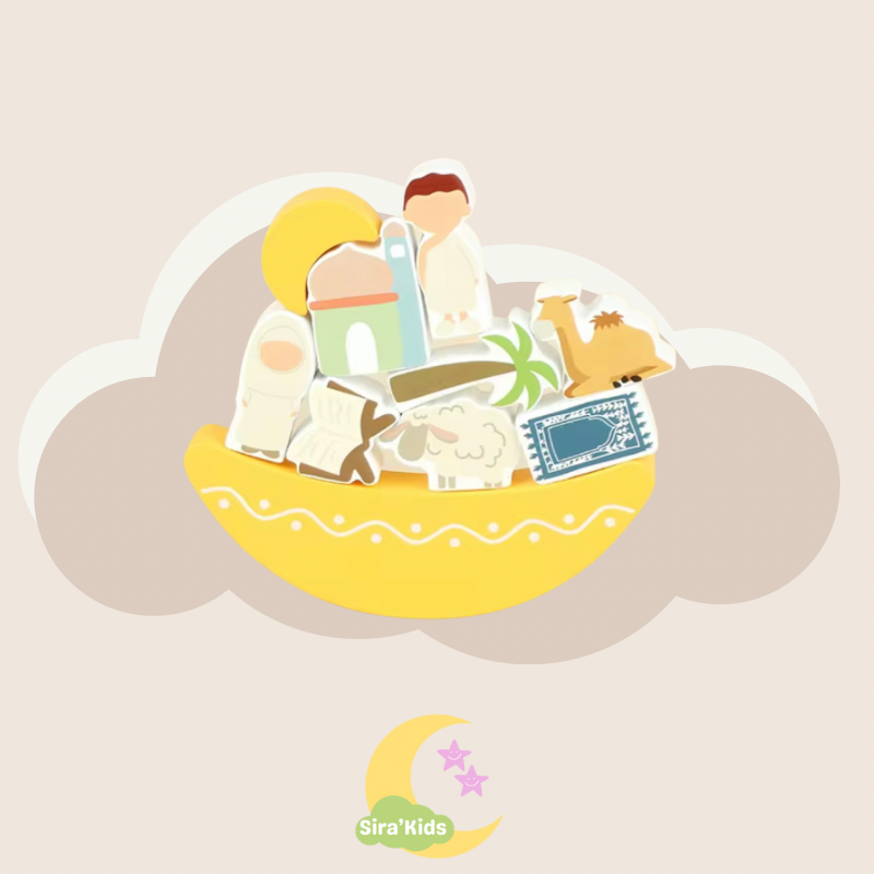 Un magnifique jeu d’équilibre en bois sur le thème de l’univers musulman. L’enfant doit empiler 9 pièces symboliques (comme la mosquée, le tapis, le mouton, le palmier ou le Coran) sur une grande lune en bois sans les faire tomber. Ce jeu développe la patience, la concentration et la motricité fine tout en familiarisant l’enfant avec les symboles importants de sa religion.