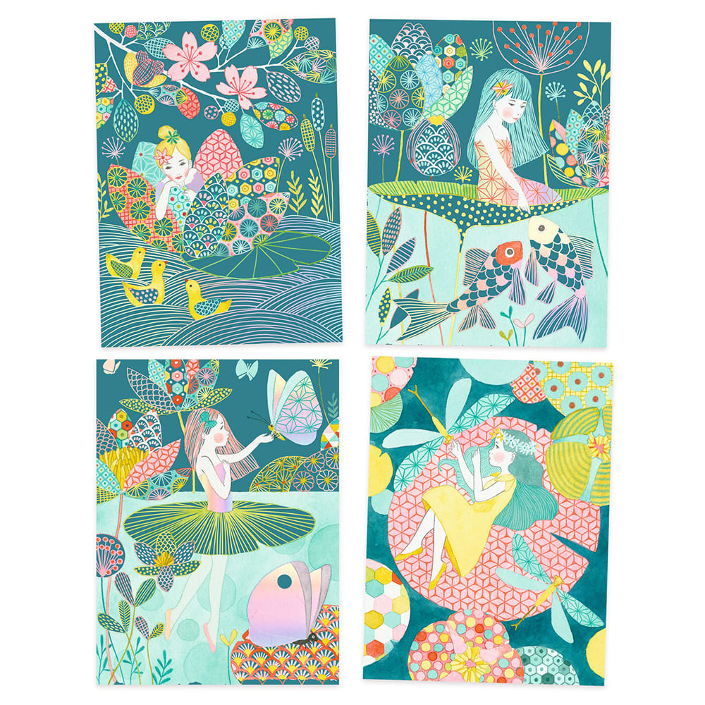Une pochette de 4 cartes à gratter aux reflets irisés pour une douce balade pleine de surprises au fil de l’eau. L’enfant reproduit les motifs imaginés par l’artiste en grattant la surface à l’aide du stylet en bois. Progressivement, les illustrations sont révélées comme par magie !