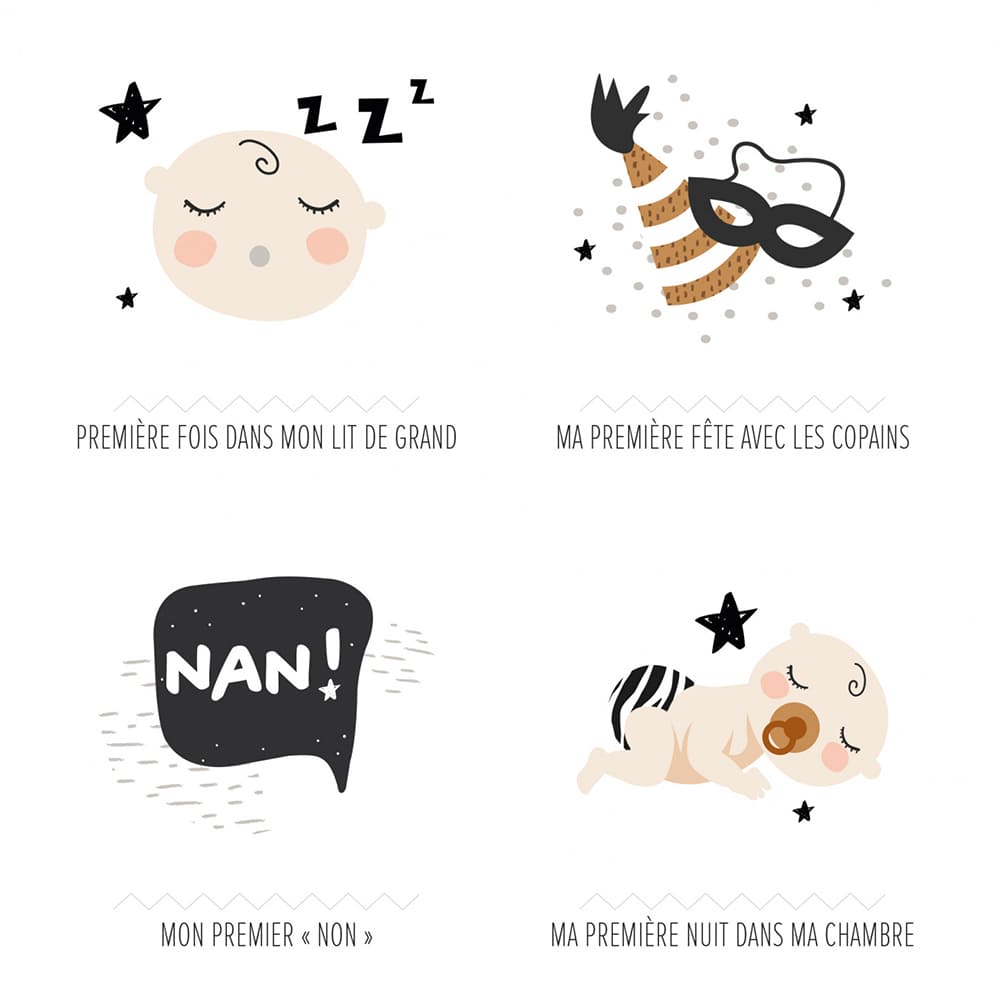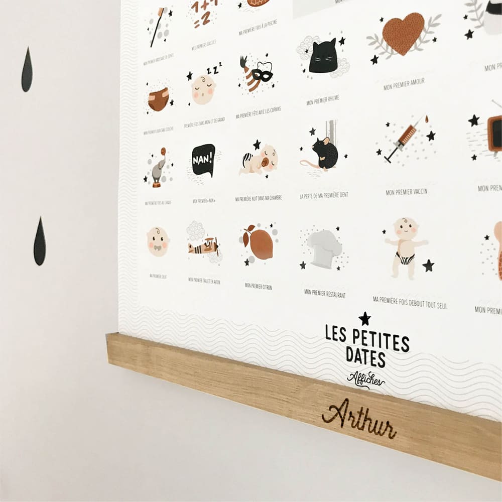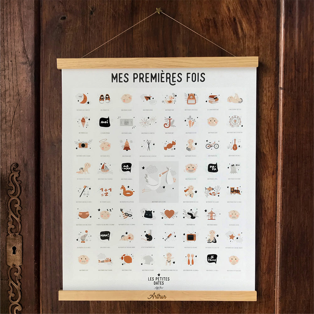 Souvenez-vous des petits moments qui comptent avec cette affiche des premières fois de bébé et son tampon dateur. L’univers graphique doux, poétique et chaleureux convient autant aux chambres des garçons qu’à celles de petites filles. Cadre/porte-affiche non compris.