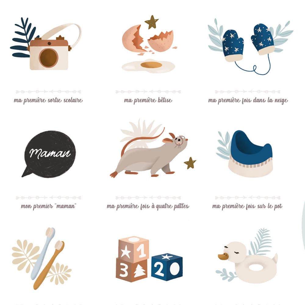 Souvenez-vous des petits moments qui comptent avec cette affiche des premières fois de bébé et son tampon dateur. L’univers graphique doux, poétique et chaleureux convient autant aux chambres des garçons qu’à celles de petites filles.