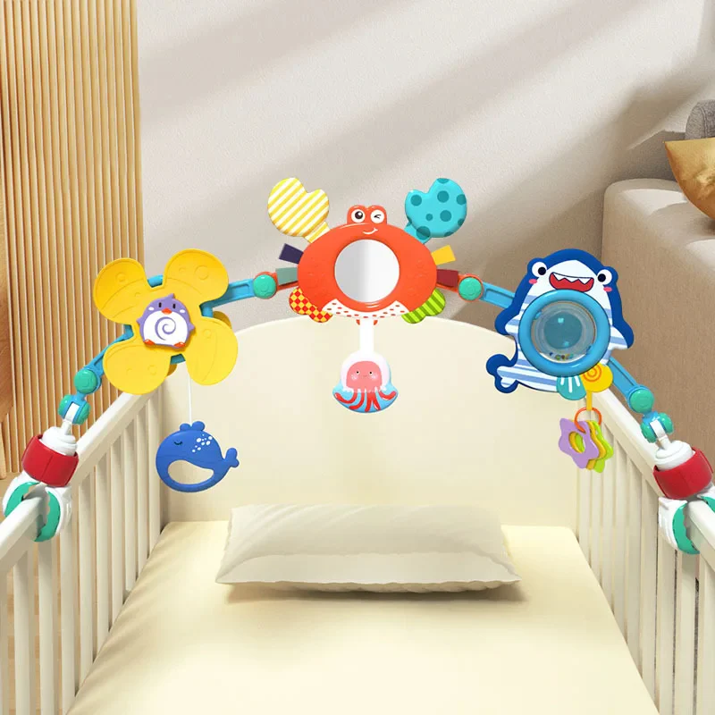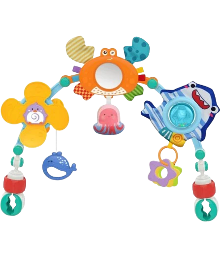 - Il y a un hochet, un anneau de dentition, un moulinet qui tourne ou un miroir de sécurité sur le trapèze