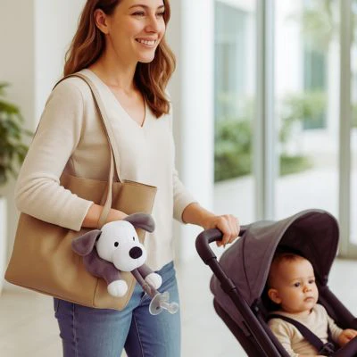 Sophie témoigne : « Je glisse MonPuppy™ mon sac le matin. Je sais exactement où trouver la tétine. Cette petite routine change tout. Je gagne du temps et de la sérénité. »