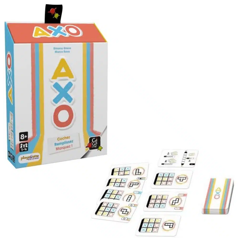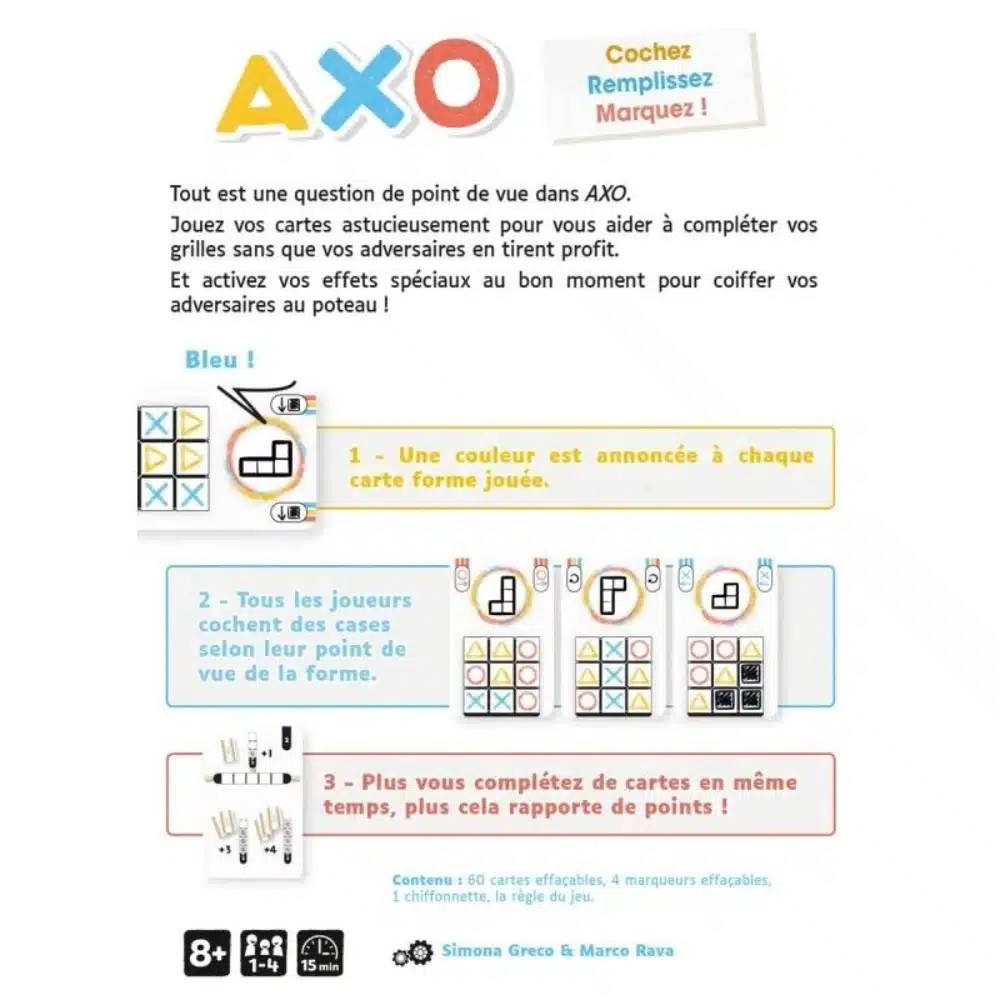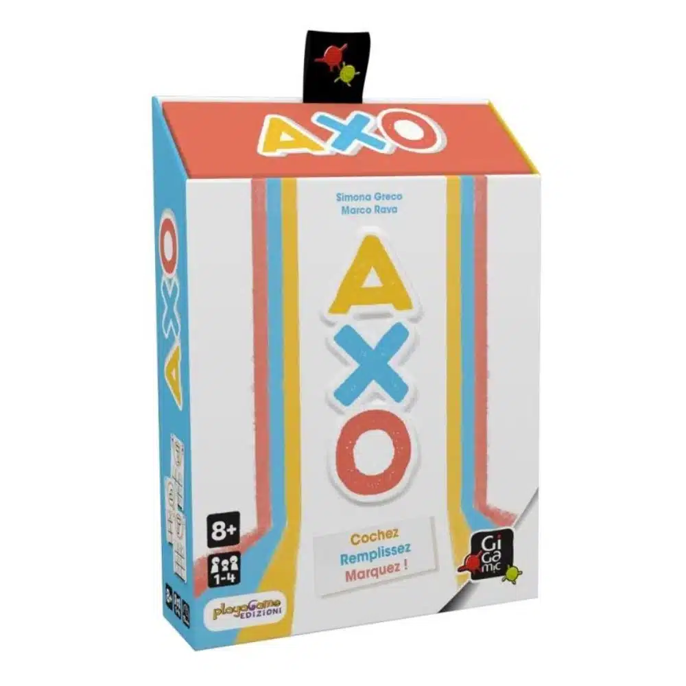 AXO édition Gigamic, cochez, remplissez, marquez ! A partir de 8 ans. De 1 à 4 joueurs, durée de la partie: 15 min.