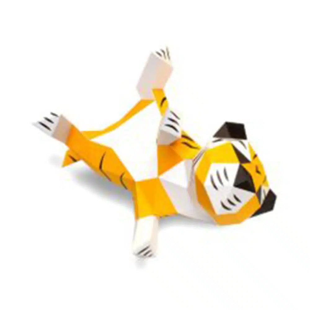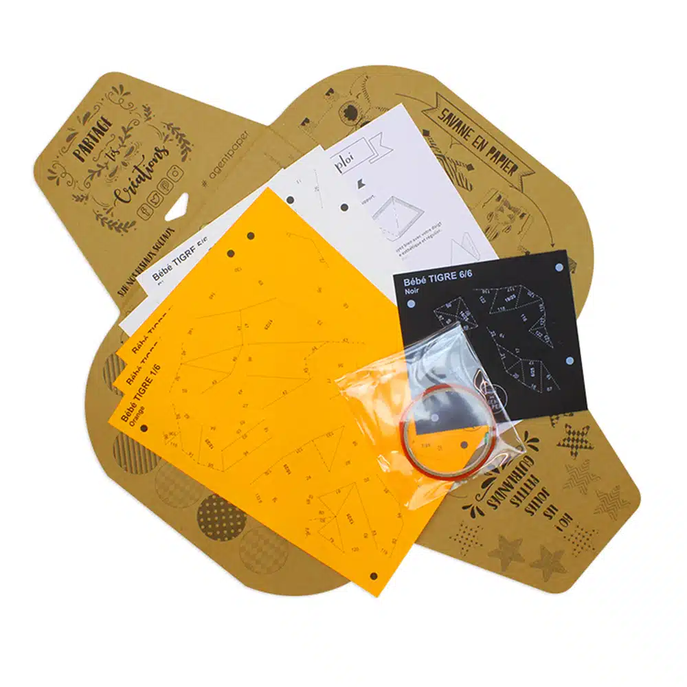 Kit de décoration à poser en papier 100% recyclé fabriqué en France. Le kit comprend des planches de pièces pré-découpées, une notice et du scotch double face, tout y est pour construire ce mignon tigrounet.