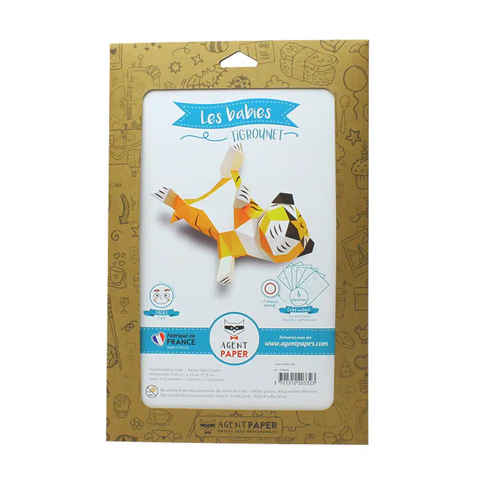 Trophée en papier 3D Babies Tigrounet, décoration originale à poser 100% fabrication française et éco-responsable de la marque Agent-Paper, à monter soi-même niveau facile.