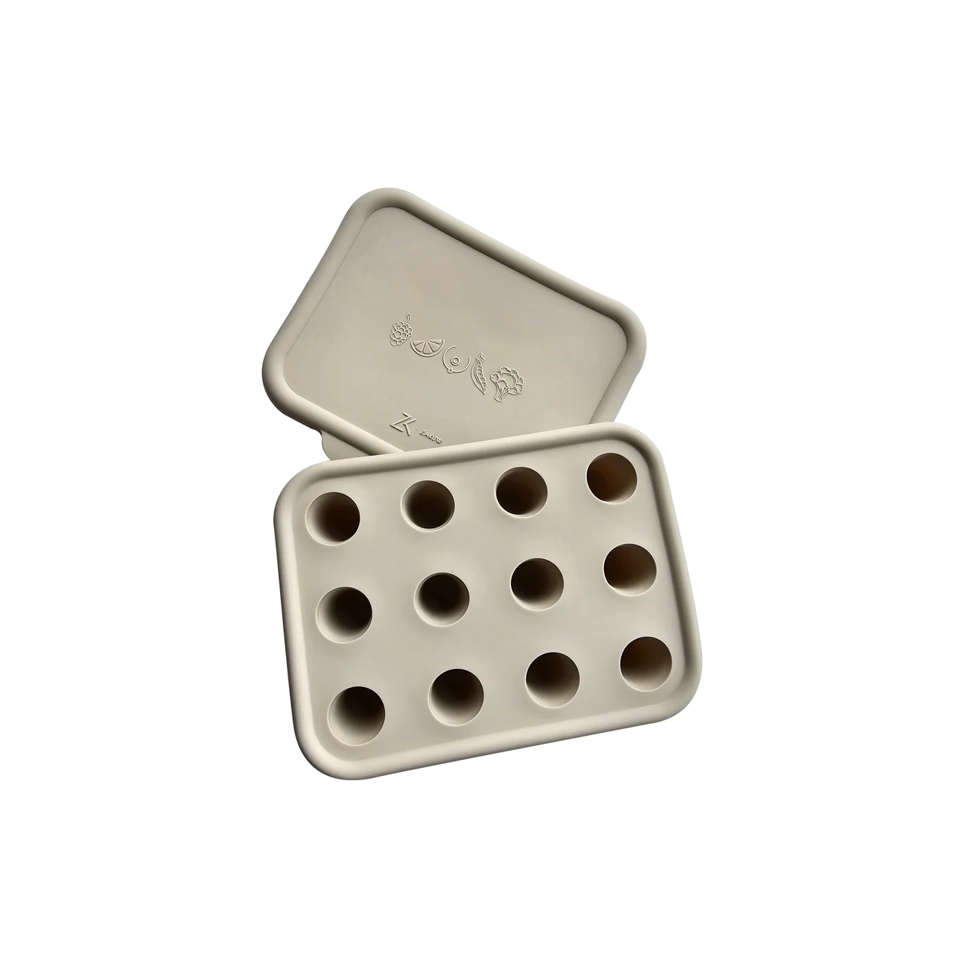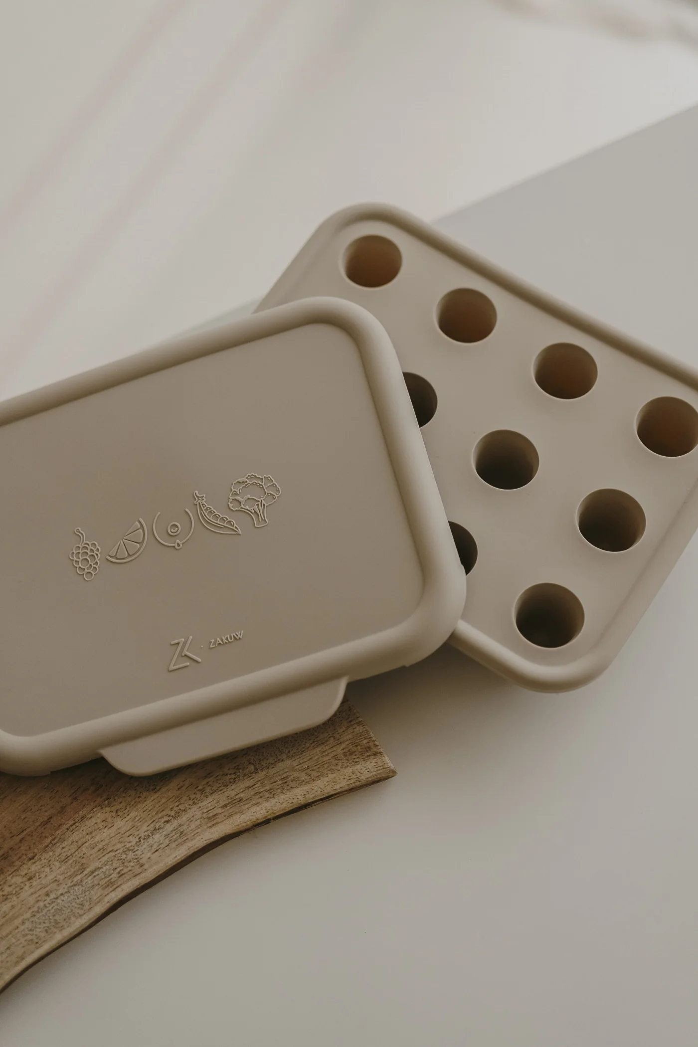 Un bac en silicone permettant de réaliser des glaçons adaptés à nos tétines grignoteuses pour congeler du lait maternel, des smoothies, purée de fruits ou légumes… pour soulager bébé lors des poussées dentaires. Normes CESilicone de qualité alimentaireContenance d’une cavité: 8ml12 cavités Existe en 2 coloris: argile et camel
