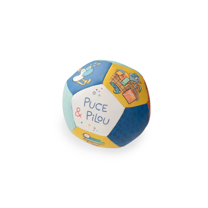 Puce mange des céréales, Cacahuète écoute de la musique, Marco a mangé des biscuits en cachette ? Petite balle en vinyle pour jouer à l’intérieur comme à l’extérieur et découvrir l’univers de Puce et Pilou.