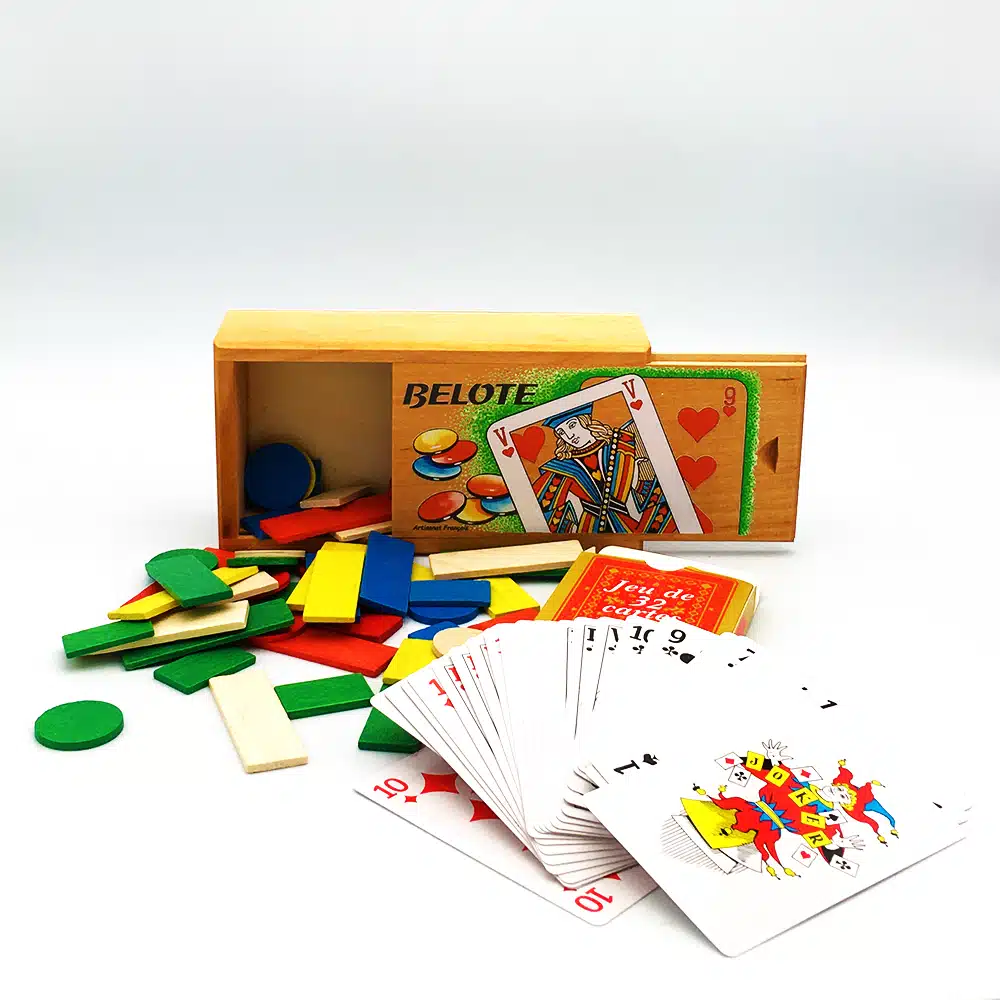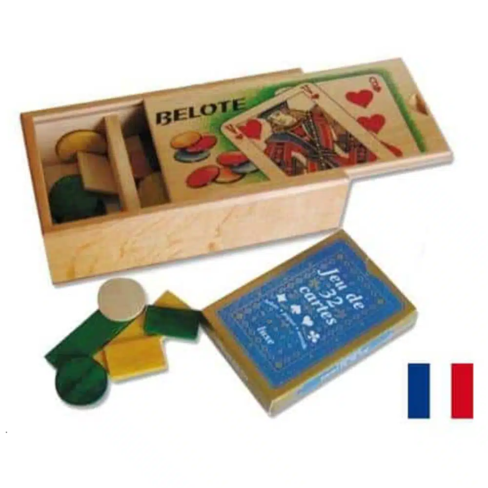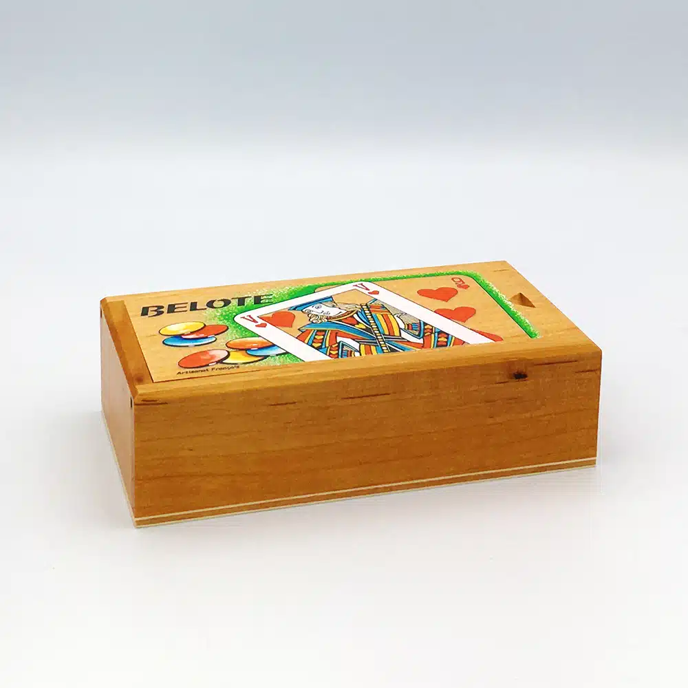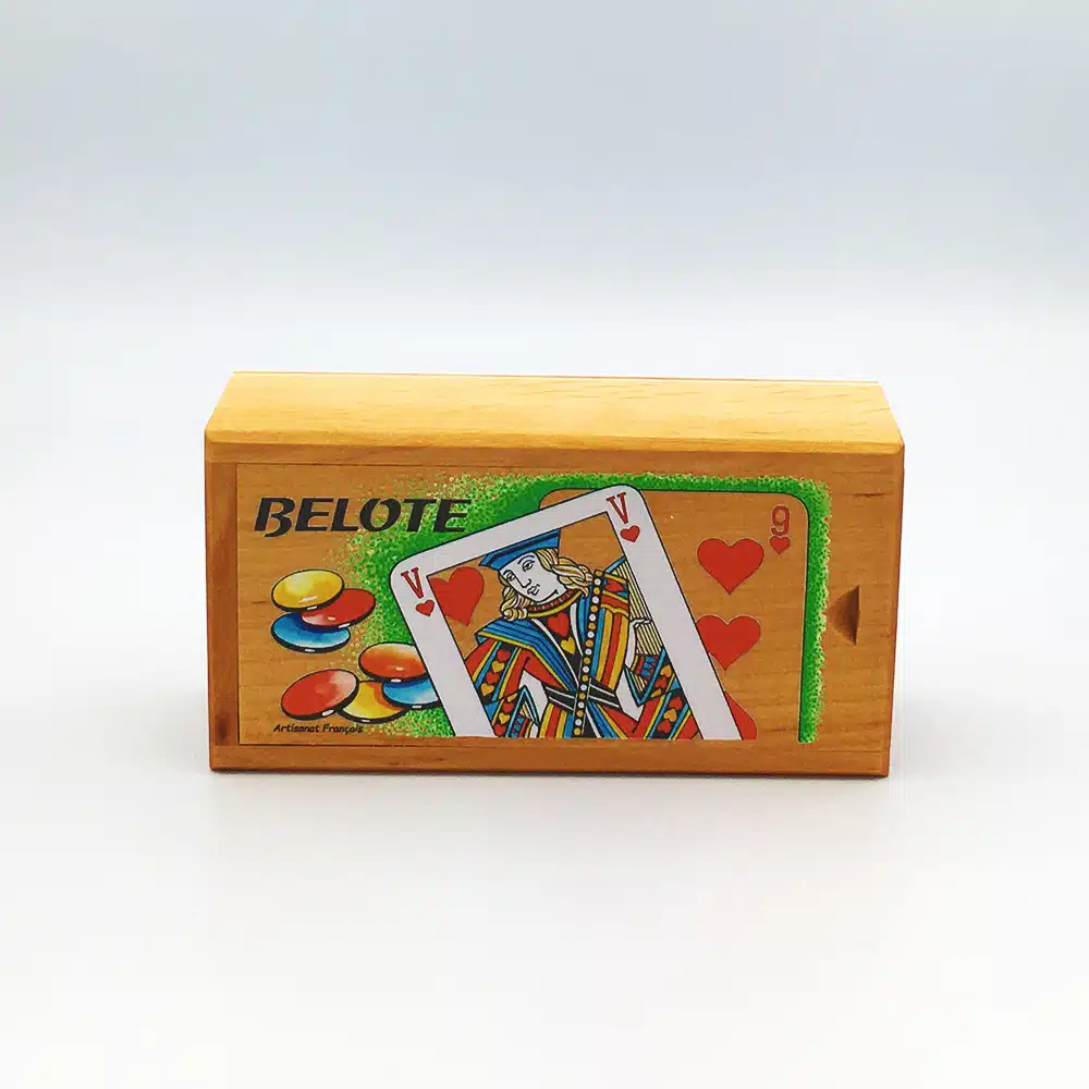 Jeu de belote avec jetons en bois dans une boîte en bois fabriquée par nos artisans dans le Jura en France. À partir de 8 ans.