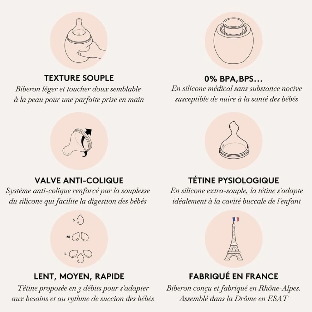 Biberon 150 ml, en silicone médical, doté d’une tétine physiologique débit Moyen. Biberon de naissance anti-colique recommandé par les pédiatres pour un meilleur confort digestif des nourrissons. Le petit format 150 ml du biberon Élhée en silicone médical souple conjugué à son système de valve anti-colique le rend deux fois plus efficace qu’un biberon rigide classique en verre ou en plastique et, limite ainsi les risques de colique.