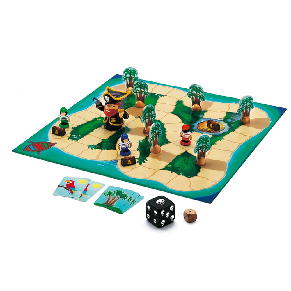 Contenu : 1 figurine pirate, 3 figurines moussaillon, 3 coffres, 1 plateau de jeu, 7 cocotiers/cachettes, 1 grand dé pirate / 1 petit dé moussaillon / 9 cartes cocotier, / 4 cartes perroquet.