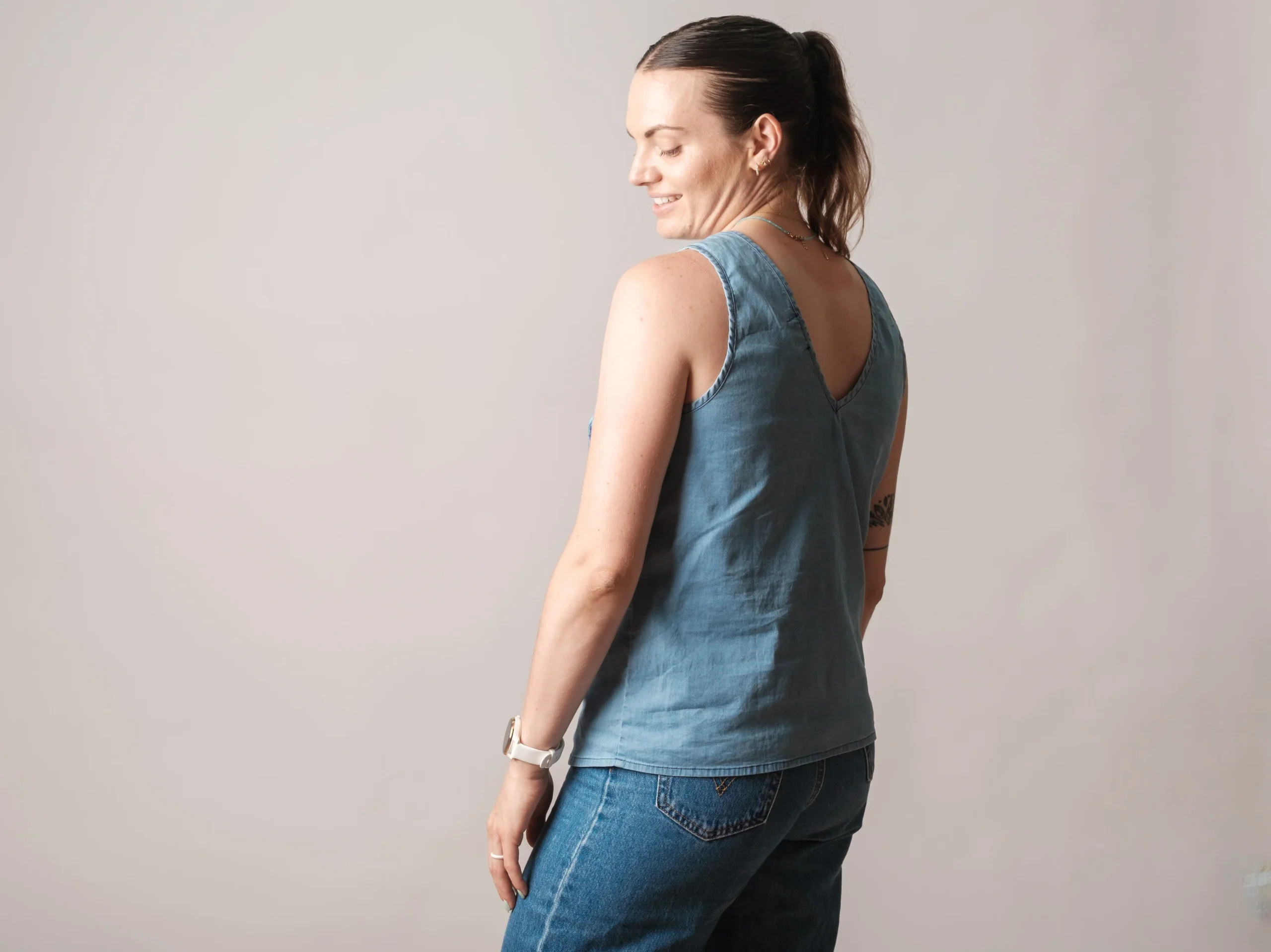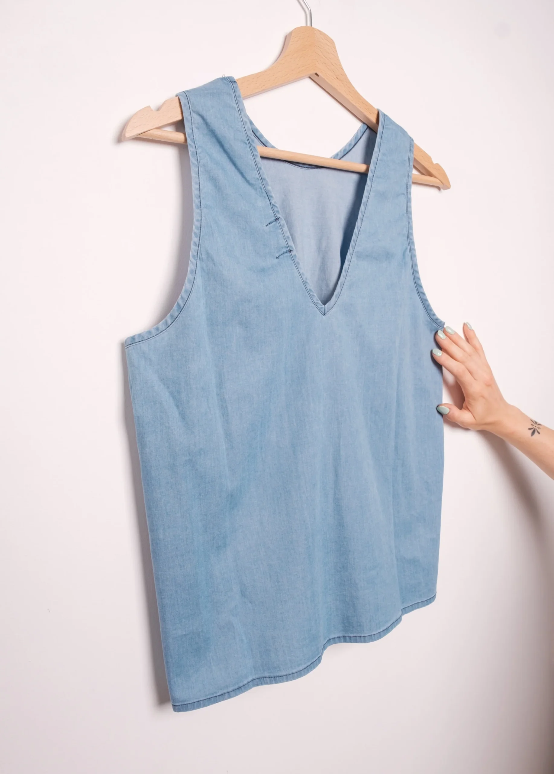 - Blouse d’allaitement sans manches, col rond, ouverture en V dans le dos.