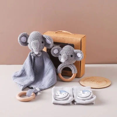 Cherchez-vous le parfait CADEAU POUR BEBE 0 – 12 mois Éléphant avec boîte qui émerveillera autant les parents que leur petit trésor? Ce coffret exquis de 4 pièces fabriquées à la main combine douceur, sécurité et émerveillement. Chaque élément a été pensé pour accompagner bébé dans ses premiers mois de découvertes.