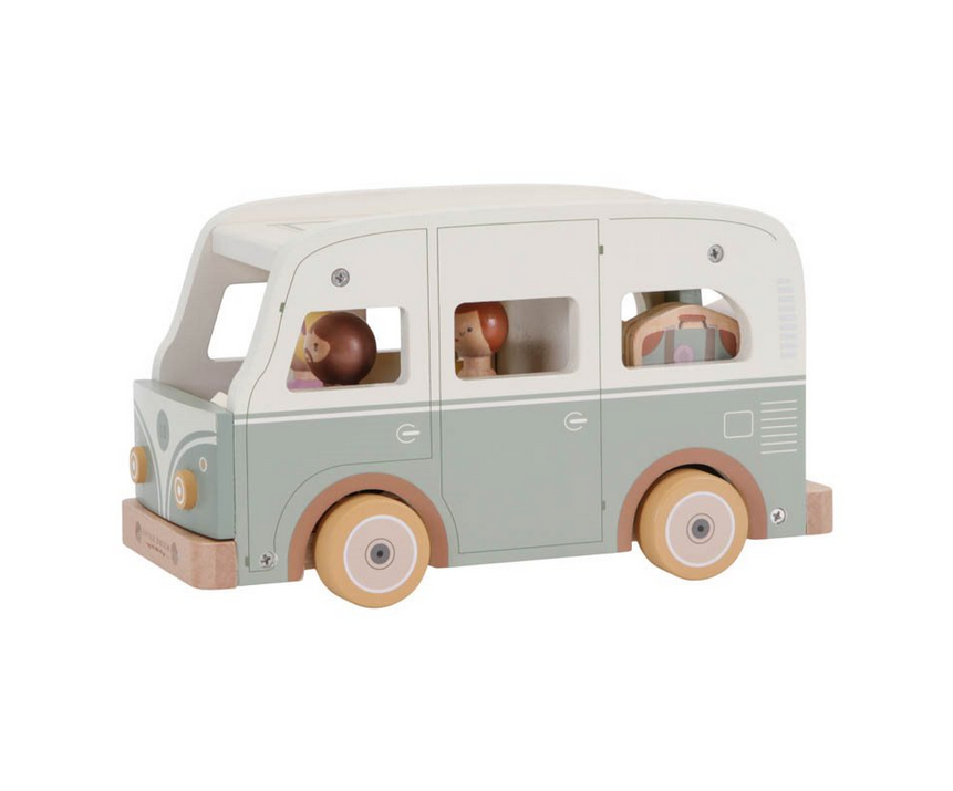 Partons à l’aventure ! Montez dans le camping-car et préparez-vous pour une journée à la plage ou une excursion en famille. N’oubliez pas d’emmener votre valise, votre sac de plage et votre planche de surf ! Vous pouvez retirer le toit de ce camping-car vintage en bois pour que les 4 poupées en bois s’y glissent facilement. Le hayon peut être ouvert pour ranger les bagages à l’arrière du camping-car. Cet ensemble de jeu complet stimule le jeu imaginatif.