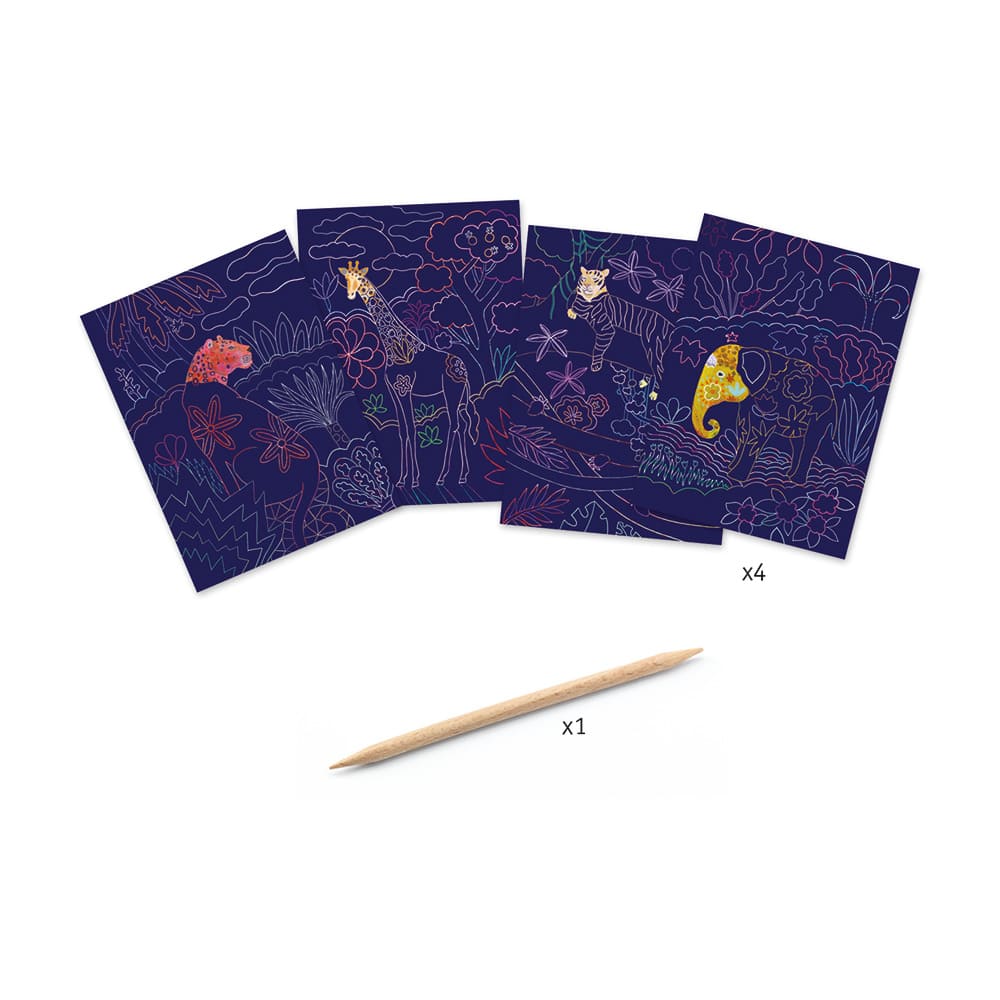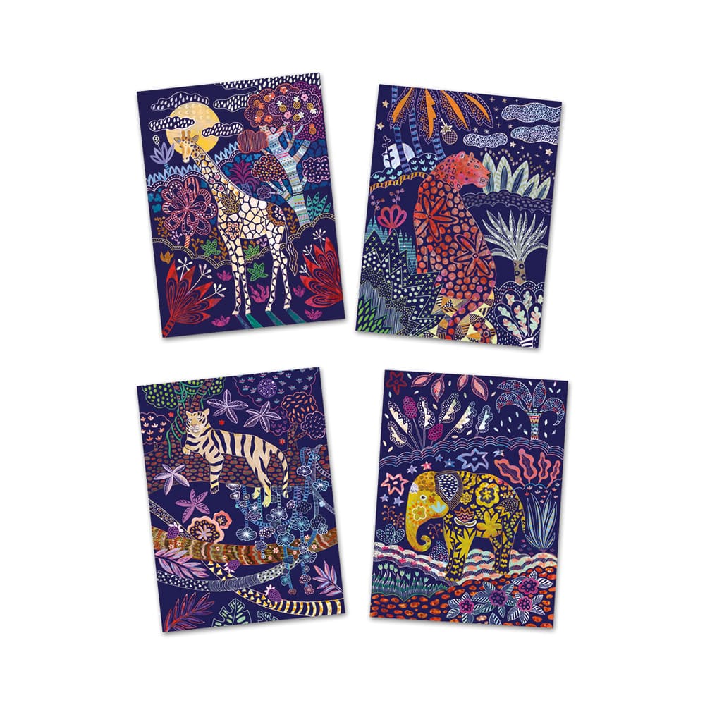 Grattez la surface de la carte pour créer pas à pas une magnifique illustration et laisser apparaitre selon les cartes une girafe, un éléphant, une panthère et un tigre.