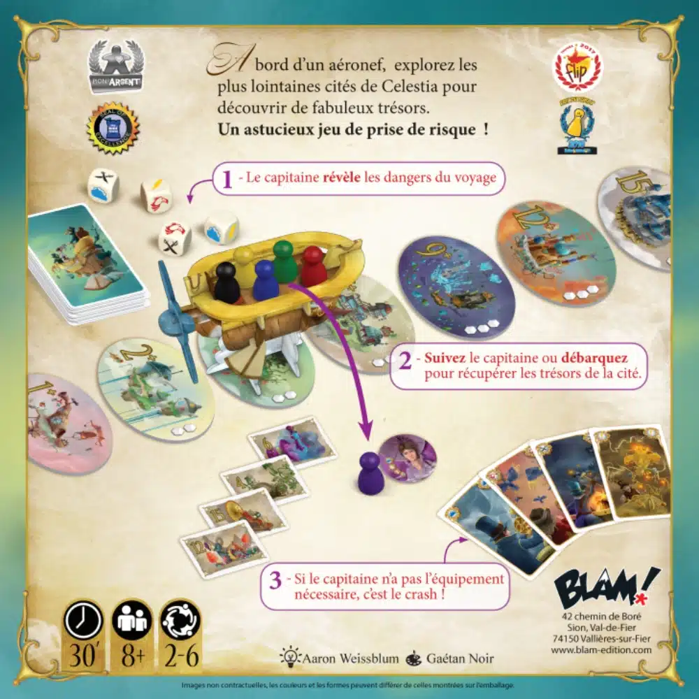 À bord d’un aéronef, explorez les cités de Celestia à la recherche de leurs trésors. À chaque tour, un nouveau capitaine doit affronter les péripéties du voyage : lui ferez-vous confiance pour atteindre la prochaine cité ? Plus vous irez loin, plus vous pourrez récupérer de fabuleux trésors… Sauf si l’aéronef s’écrase ! Un astucieux jeu de prise de risque dans un monde onirique.