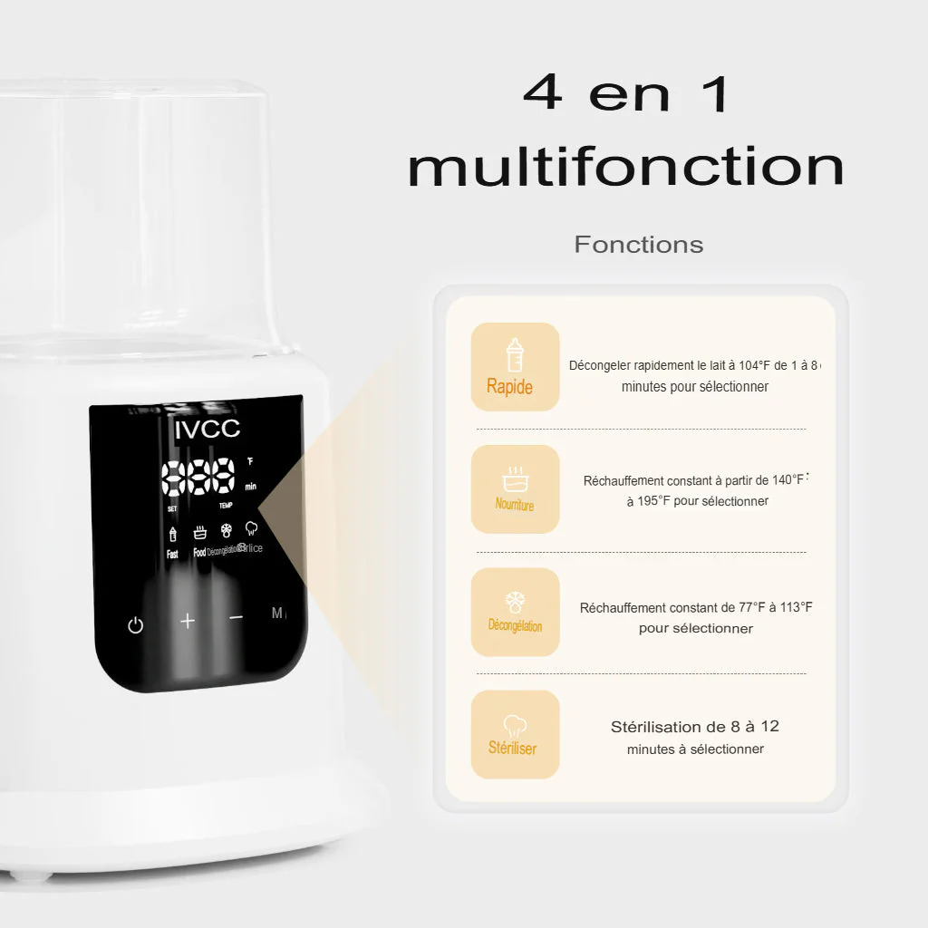 Ce chauffe-biberon rapide permet de chauffer 120 ml de lait à 40 °C en seulement 3 minutes. Grâce à sa fonction de stérilisation, son écran LCD et son maintien au chaud 24h, il répond parfaitement aux besoins des jeunes parents en quête de praticité et de sécurité.