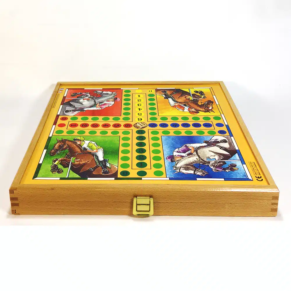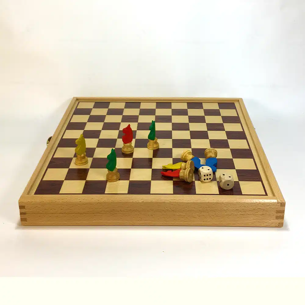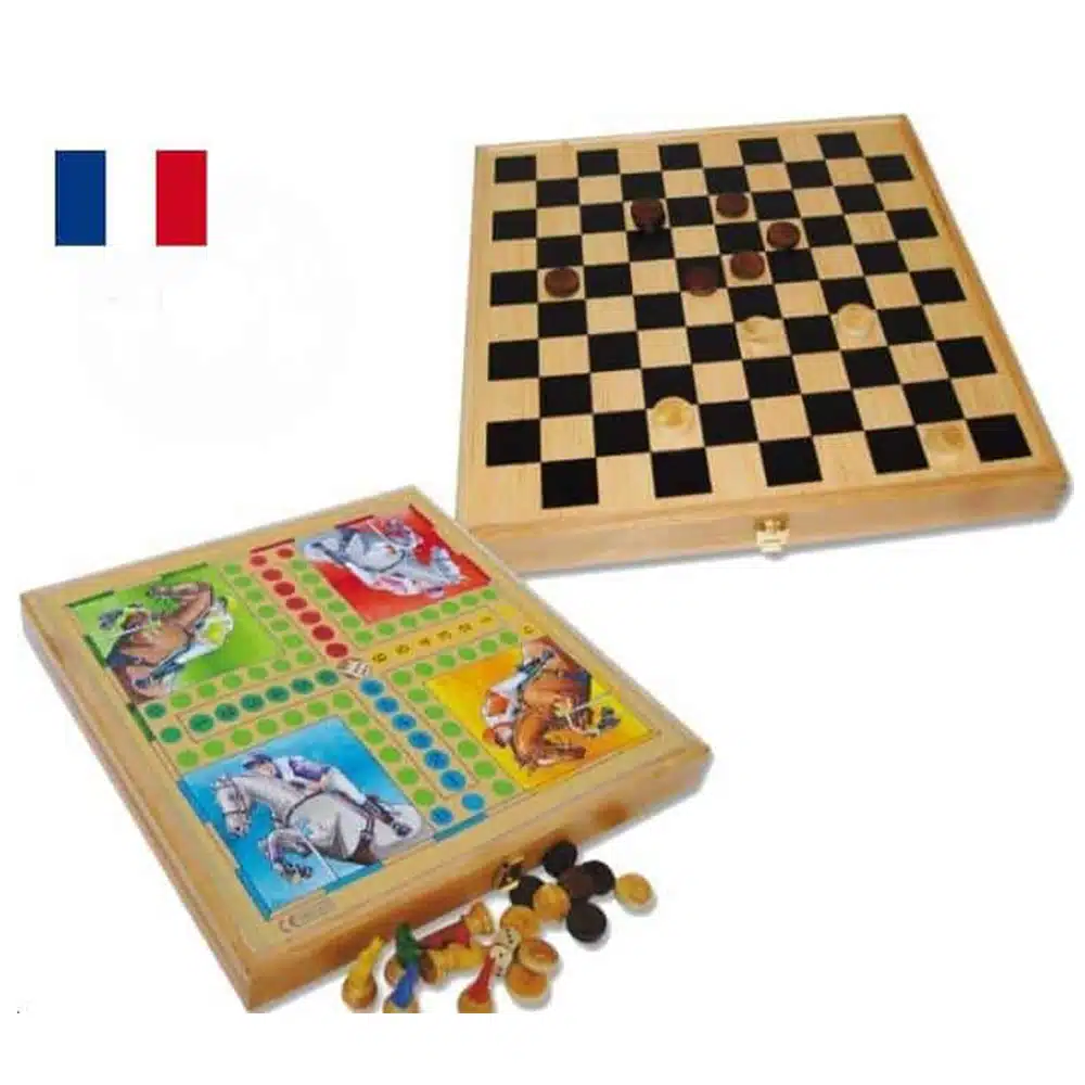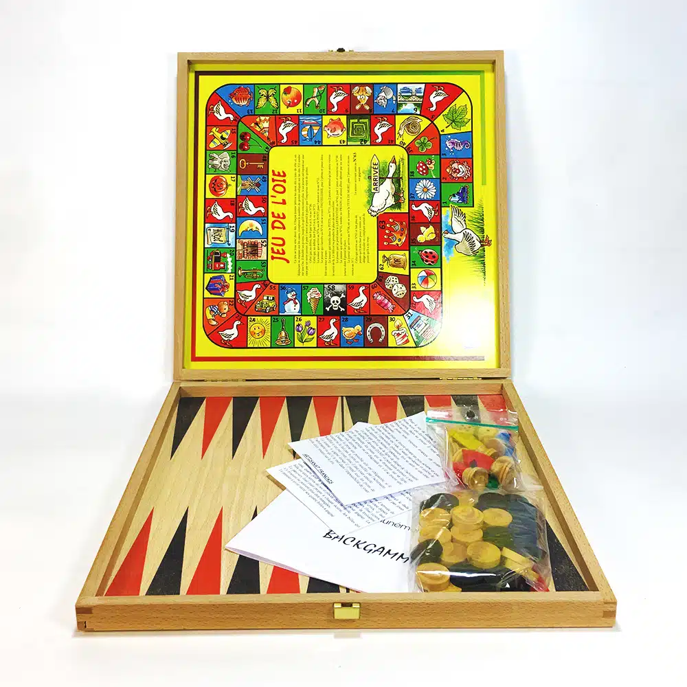 Coffret en bois et carton fabriqué en France, 2 plateaux de jeux sur l’extérieur: damier (couleur marron) et petits chevaux; et 2 plateaux en intérieur: backgammon et jeu de l’oie.
