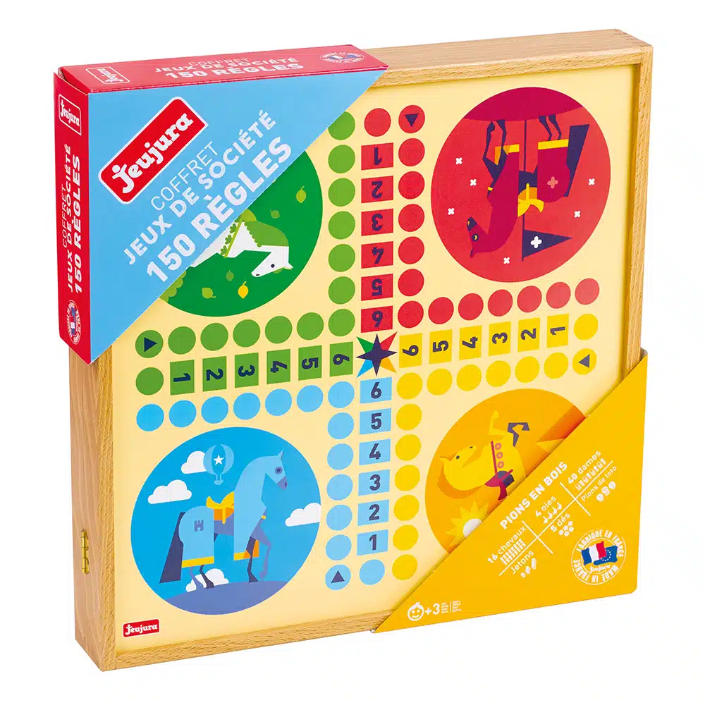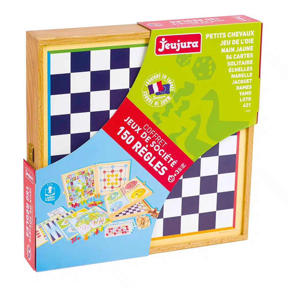 Coffret de jeux de société en bois, 150 règles, de la marque Jeujura, fabriqué dans le Jura en France. À partir de 3 ans.