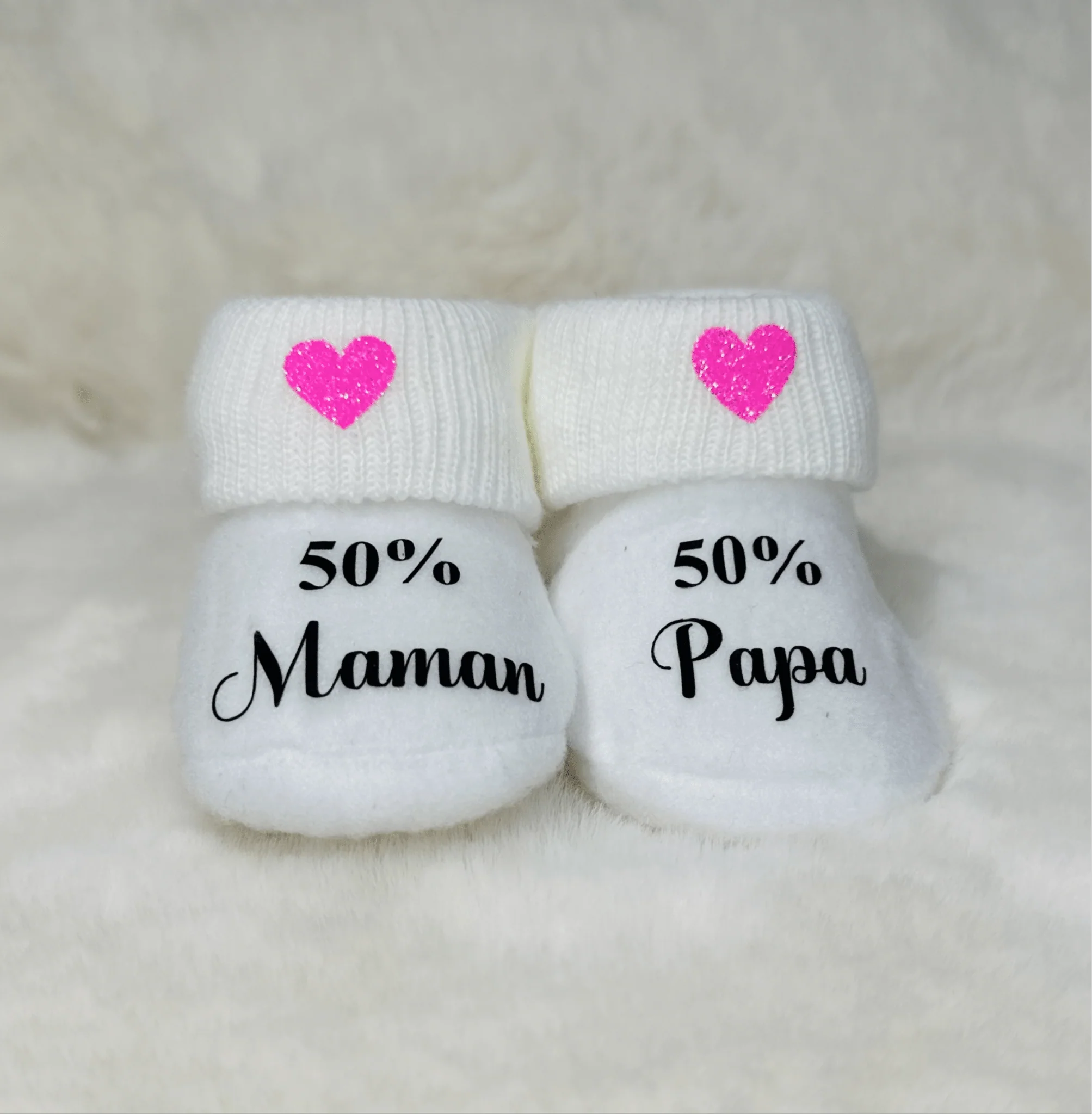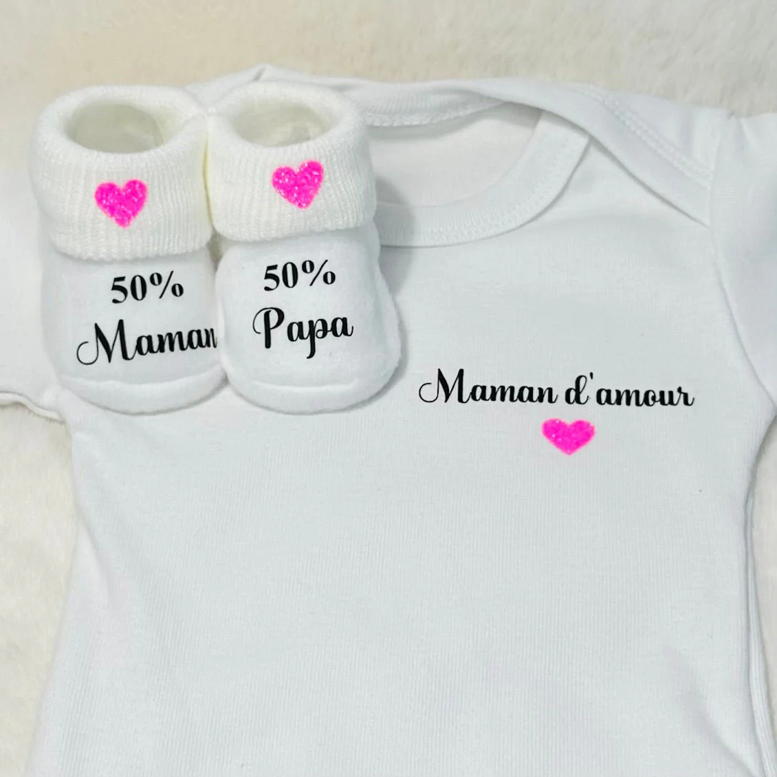 Ce qui rend ce coffret véritablement unique, c’est la possibilité de personnaliser la couleur du cœur, permettant ainsi aux parents de choisir une teinte qui correspond à leurs goûts ou à ceux de leur bébé. Les inscriptions sur le body et les chaussons sont réalisées en noir, offrant un contraste élégant et moderne qui met en valeur le design et les messages d’amour.