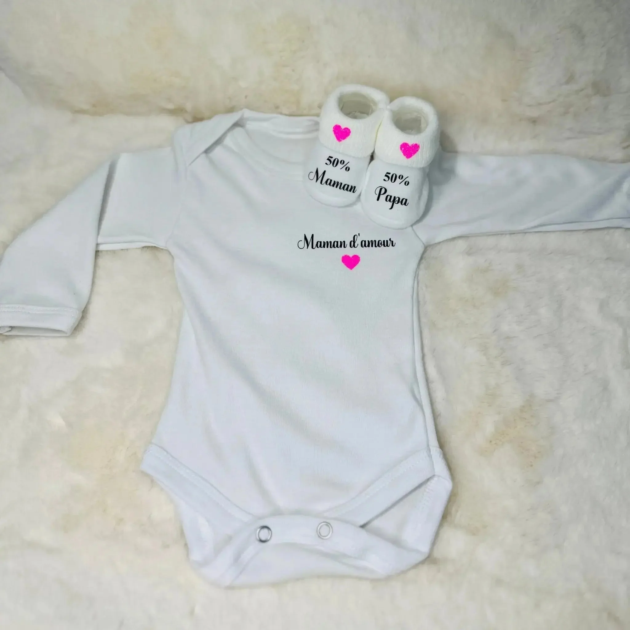 Le body, confectionné en coton doux et confortable, est parfait pour la peau sensible des bébés, garantissant à la fois confort et style. Les chaussons, également fabriqués avec attention, ajoutent une touche de chaleur et de tendresse à l’ensemble.