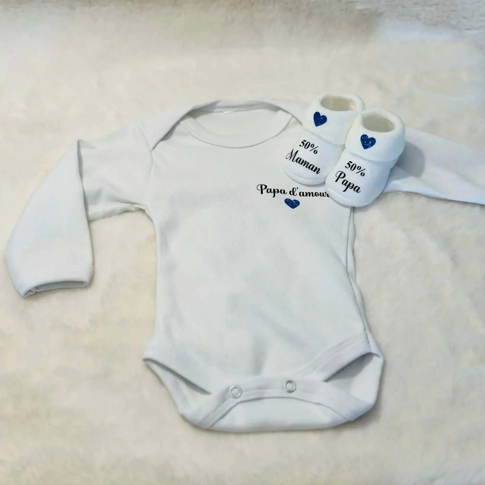 Le body, confectionné en coton doux et confortable, est parfait pour la peau sensible des bébés, garantissant à la fois confort et style. Les chaussons, également fabriqués avec attention, ajoutent une touche de chaleur et de tendresse à l’ensemble.