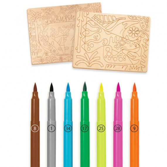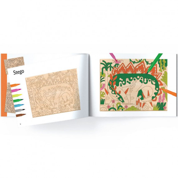 Une activité de coloriage originale sur des tableaux de bois. L’enfant suit les indications de l’artiste pour mettre en couleurs les illustrations de dinosaures grâce aux feutres pinceaux fournis. Pratiques, les sillons gravés au laser conduisent l’encre et évitent aux couleurs de se mélanger…