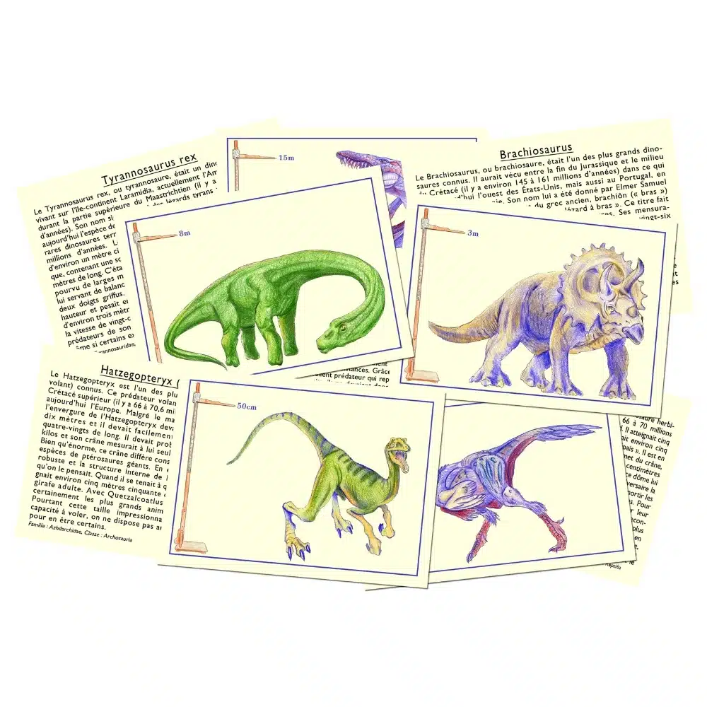 Cette jolie boîte contient 22 cartes avec dessins et descriptions de 21 espèces de dinosaures les plus connus : tyrannosaure, diplodocus, stégosaure, brachiosaure… Tout ce que nous connaissons aujourd’hui à propos de leur existence nous vient des rares fossiles retrouvés. Ils étaient tous très différents, taille, peau, régime alimentaire…