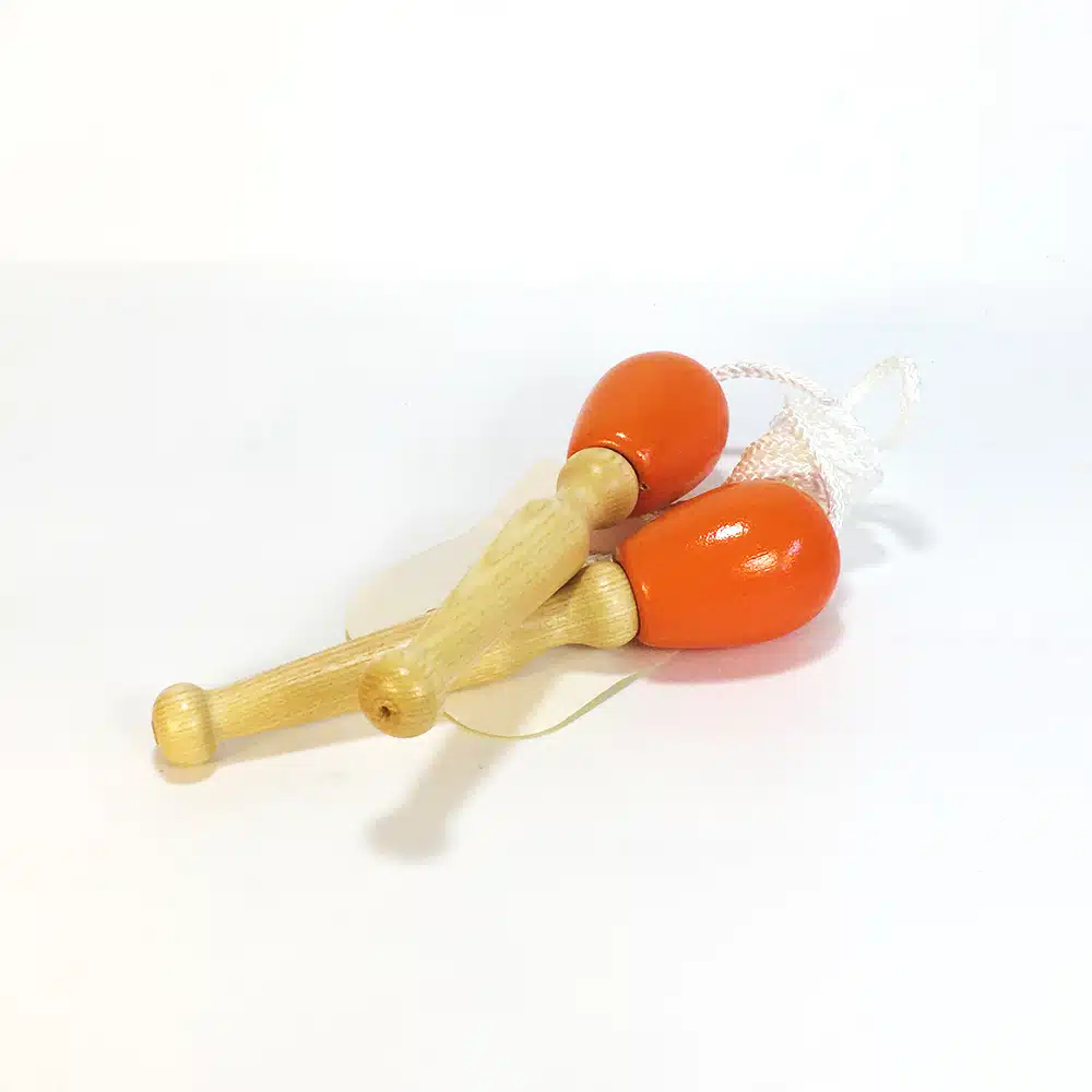 Corde à sauter, poignées ovales en bois laqué, 2m40 de longueur, taille réglable : le manche se dévisse pour pouvoir raccourcir la longueur de la corde.