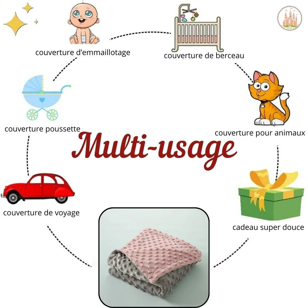 Que ce soit à la maison ou lors de vos sorties, cette couverture est toujours là pour envelopper votre petit trésor. Utilisez-la pour les moments de câlins, comme un accessoire dans la poussette ou même lors des séjours chez des amis. Un véritable allié au quotidien pour le bien-être de votre enfant.