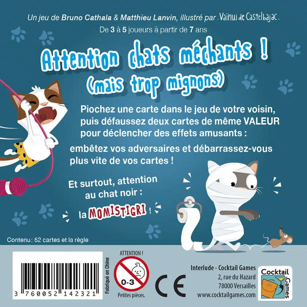 Piochez une carte dans le jeu de votre voisin, puis défaussez deux cartes de même VALEUR pour déclencher des effets amusants : embêtez vos adversaires et débarrassez-vous plus vite de vos cartes ! Et surtout, attention au chat noir : la momistigri !