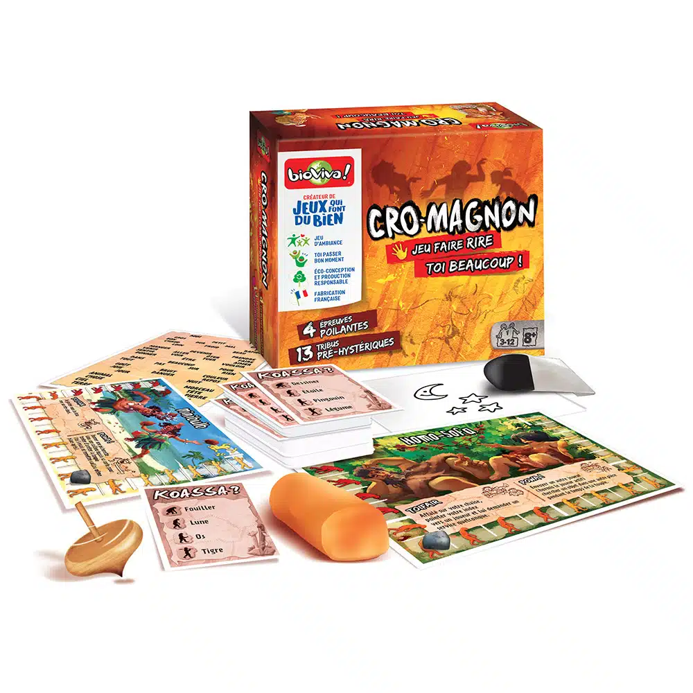 Jeu d’ambiance, de 3 à 12 joueurs, à partir de 8 ans, environ 30 min, de la marque Bioviva, fabriqué en France et éco-conçu, pour redécouvrir ses aptitudes ancestrales en mimant, modelant, parlant et dessinant.