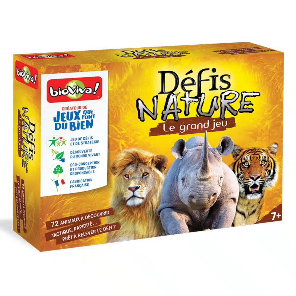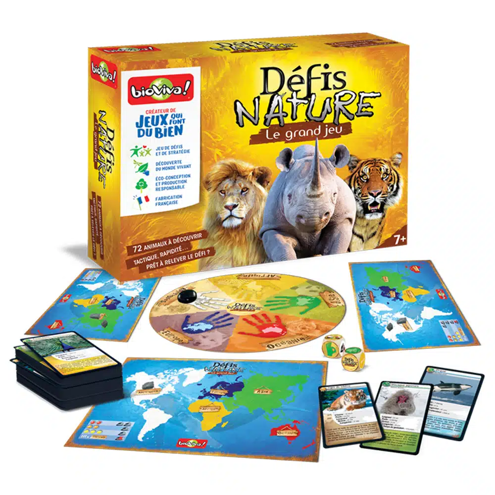 Jeu de défis et de stratégie, de 2 à 6 joueurs, à partir de 7 ans, environ 40 min, de la marque Bioviva, fabriqué en France et éco-conçu, pour entrer dans la bataille et mener tes animaux à la victoire sur les cinq continents!