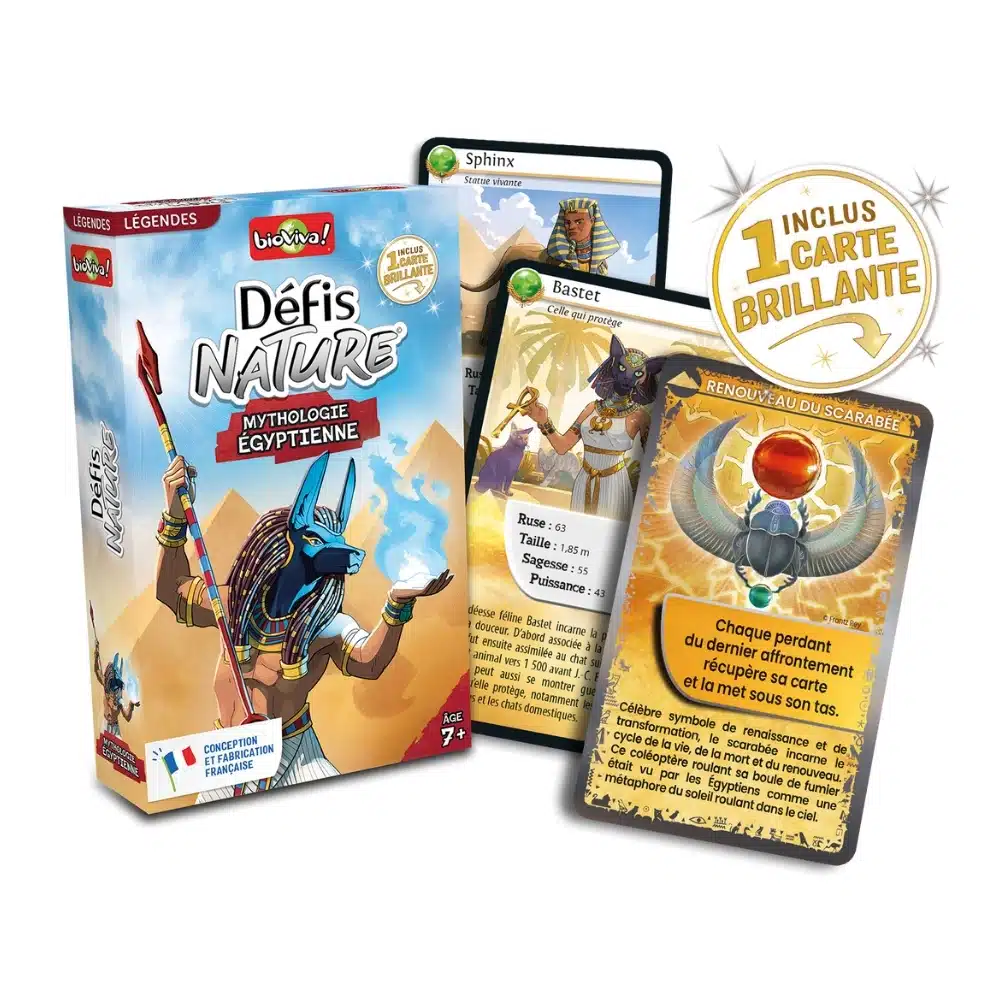Un jeu de bataille qui fait fureur dans les cours de récré, qui peut être joué en suivant les règles, sur le principe de devinettes ou simplement en lisant les cartes pour tout savoir sur la mythologie égyptienne.
