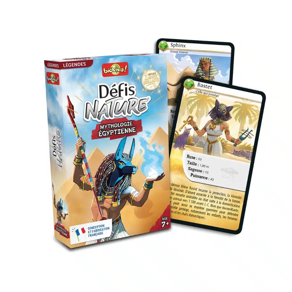 Jeu de cartes, de 2 à 6 joueurs, environ 20 min, de la marque Bioviva, fabriqué en France et éco conçu, vous emmène à la rencontre des dieux, déesses et créatures de la mythologie égyptienne.