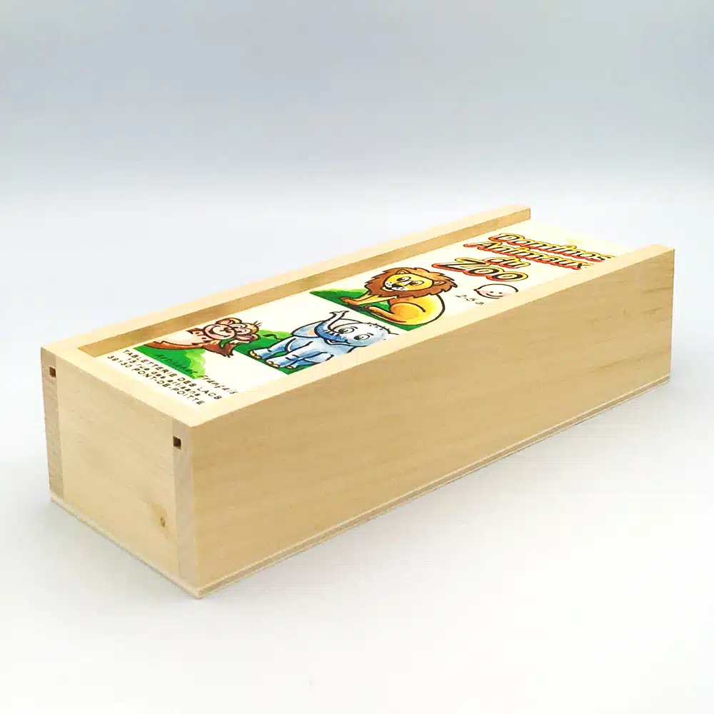 28 dominos illustrés avec les animaux du zoo. En bois de hêtre dans une belle boîte en bois de tilleul avec ouverture coulissante.