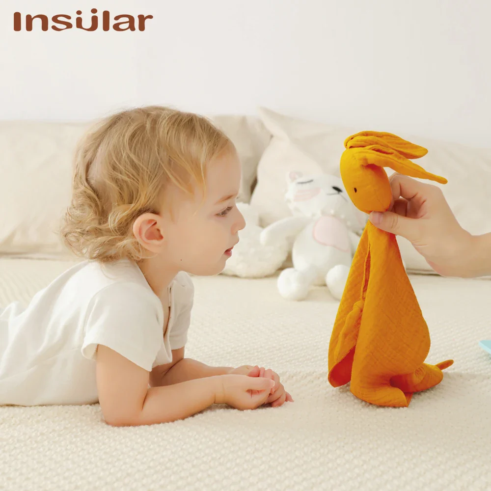 doudou bébé mousseline lapin orange couverture enfant regarde