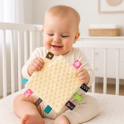 Le doudou étiquette est conçu pour stimuler la curiosité naturelle de votre bébé. Les étiquettes colorées autour de la bordure encouragent l’exploration tactile, favorisant le développement de la motricité fine.
