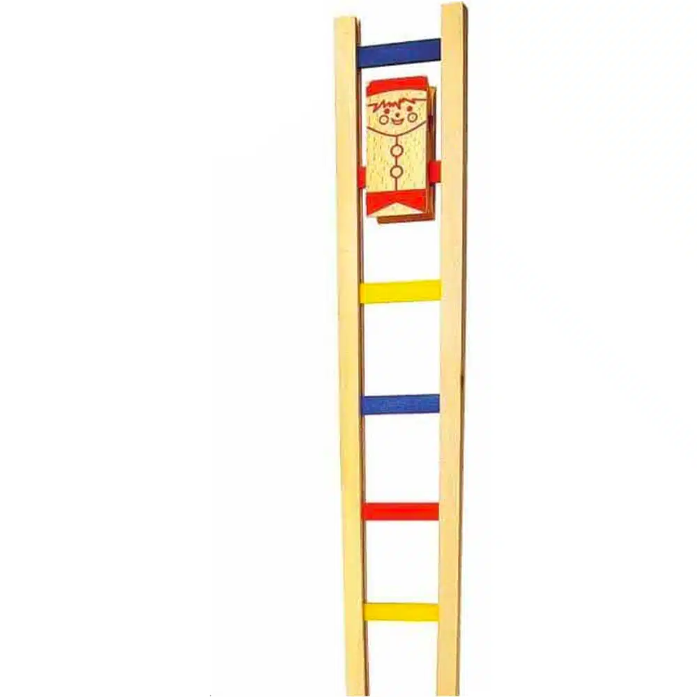 Placez le bonhomme en bois sur le barreau le plus haut de l’échelle, lâchez le et regardez le descendre en faisant des cabrioles !