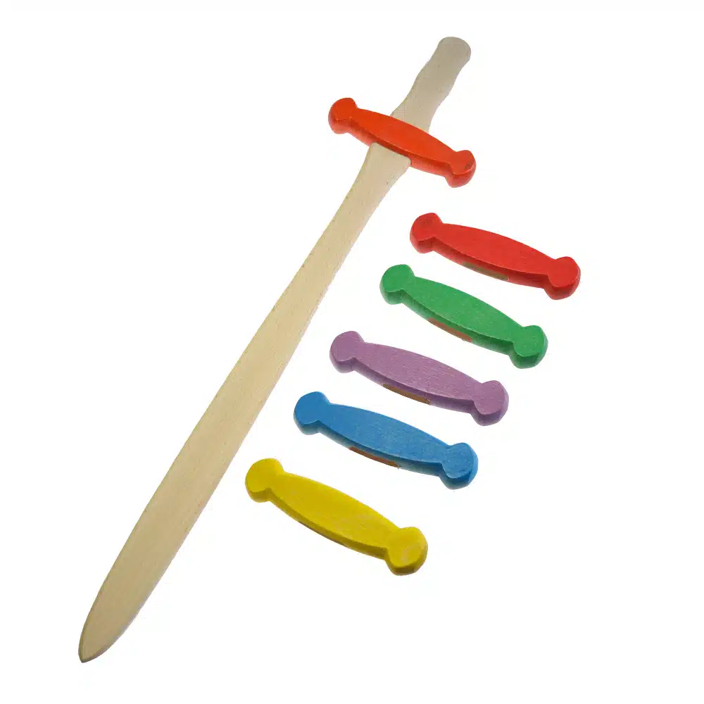 Epée en bois colorée fabriquée par nos artisans du Jura en France. À partir de 2 ans.