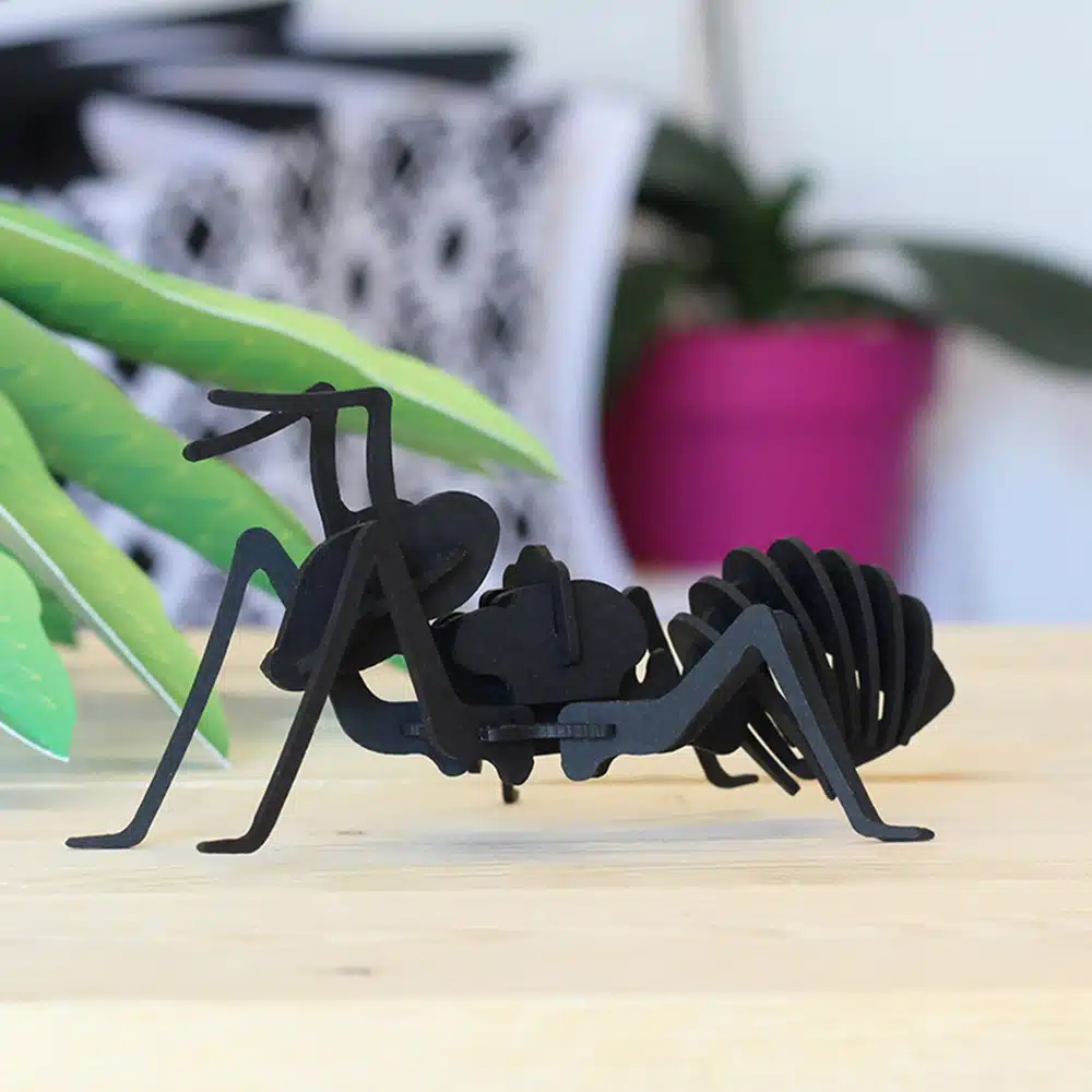 Maquette insecte fourmi en carton noir, décoration originale à poser 100% fabrication française et éco-responsable de la marque Agent-Paper, à monter soi-même niveau facile.
