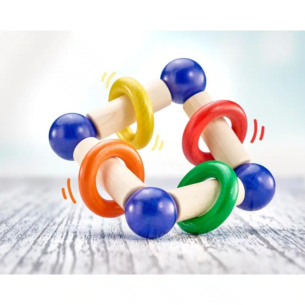Hochet carré en bois massif, flexible, coloré, avec anneaux.