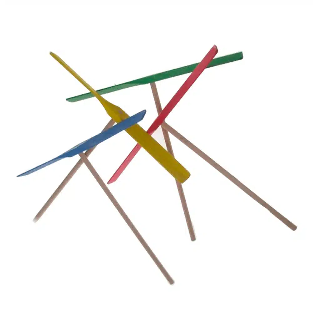 Hélice en bois montée sur une tige, faites la tourner entre les mains (main droite vers l’avant) pour la faire décoller à la façon d’un hélicoptère.