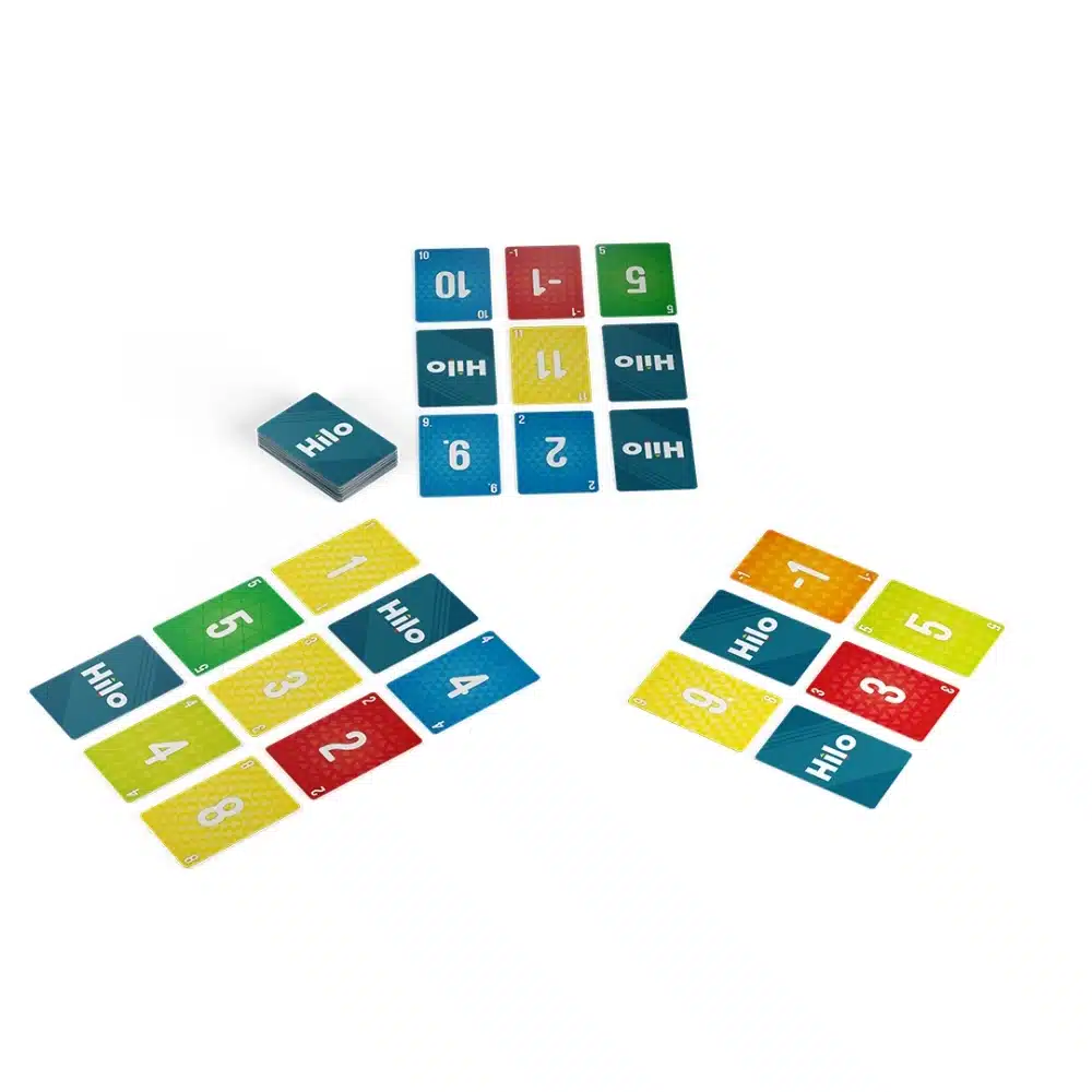 Dans Hilo, remplacez le plus vite possible les cartes de valeur élevée par des cartes plus faibles dans votre étalage ou supprimez des rangées entières. Car c’est le joueur ayant le moins de points qui gagnera la partie. Dès que l’un des joueurs a retourné toutes ses cartes, la manche se termine.