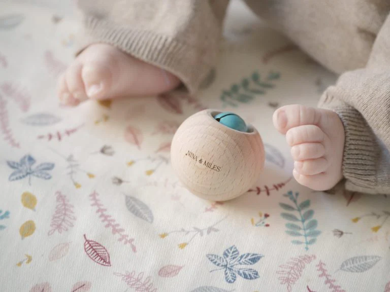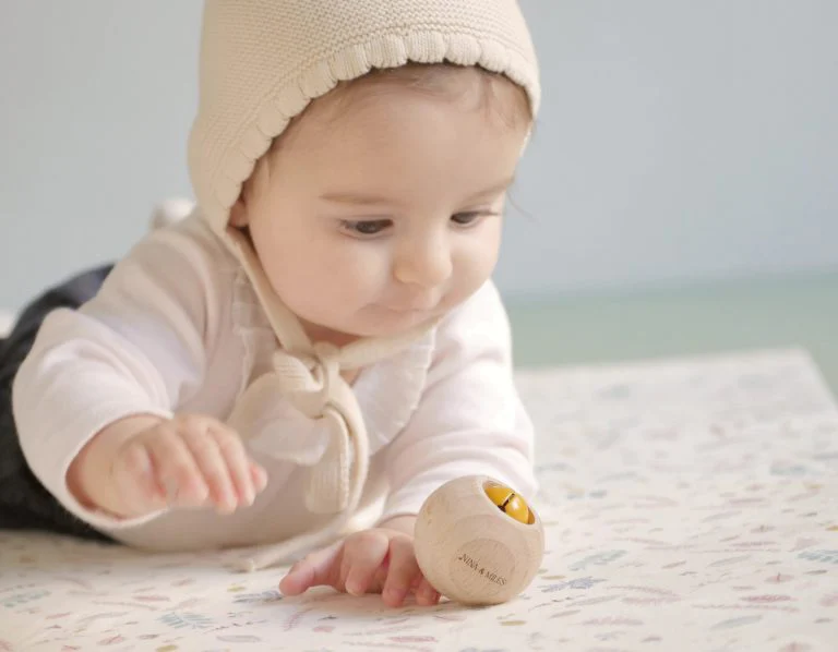 La forme boule de ce hochet fait référence aux solides géométriques de Montessori. Ainsi, en manipulant ce hochet, bébé s’initiera à la géométrie des volumes et développera son sens du toucher.