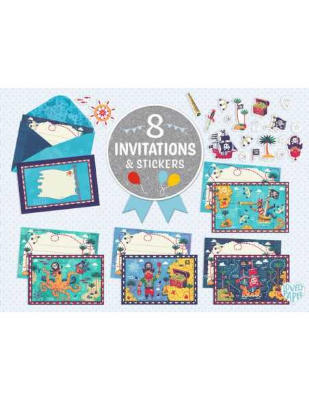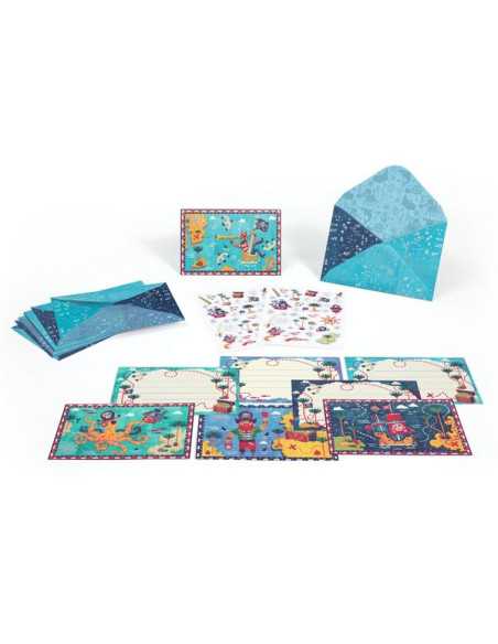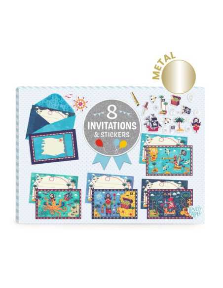 Découvrez les cartes d’invitation Tous à bord de Lovely paper by Djeco, un coffret de papeterie aux effets métallisés renfermant des cartes d’invitation illustrées sur le thème des pirates, des enveloppes assorties et des planches de stickers pour personnaliser chaque message.