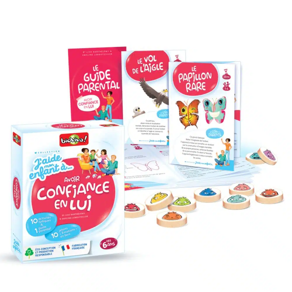 Coffret de 10 activités ludiques: « J’aide mon enfant à… avoir confiance en lui », de 1 à 6 participants, à partir de 6 ans, environ 20 min, de la marque Bioviva, fabriqué en France et éco-conçu.