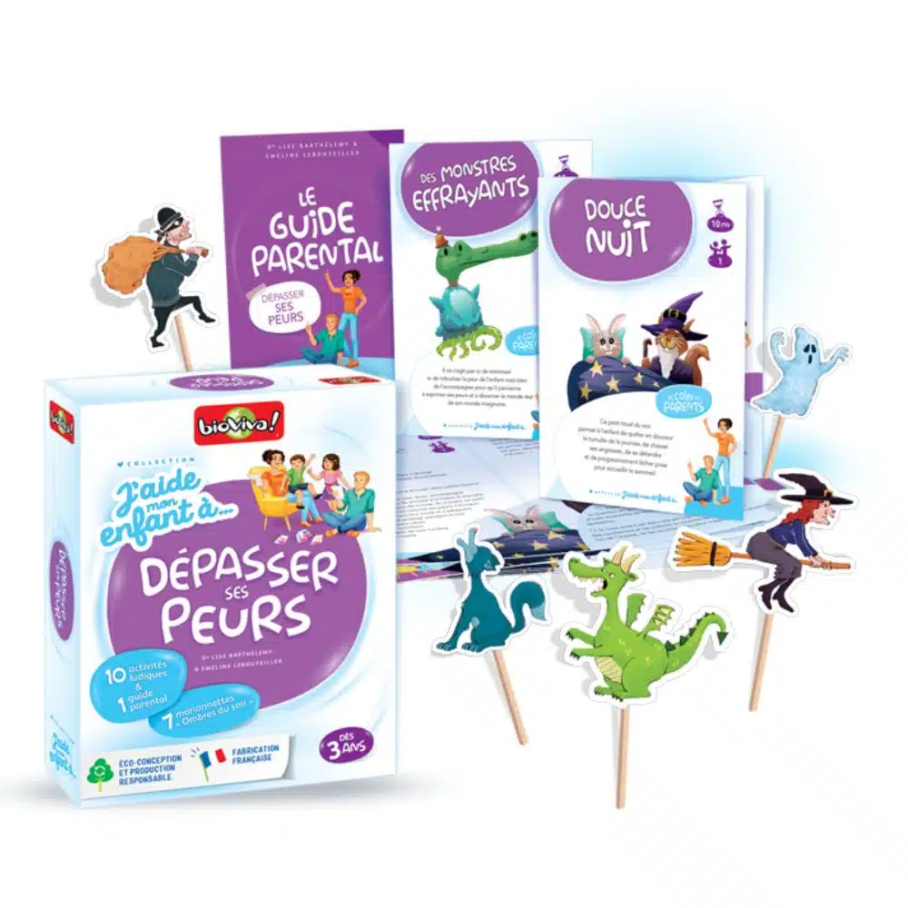 Coffret de 10 activités ludiques: « J’aide mon enfant à… dépasser ses peurs », de 1 à 6 participants, à partir de 3 ans, durée d’une activité de 10 à 20 min, de la marque Bioviva, fabriqué en France et éco-conçu.