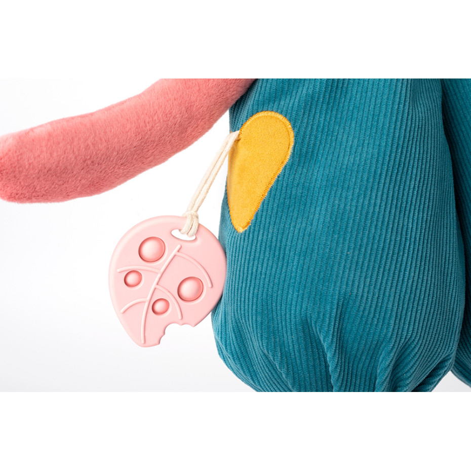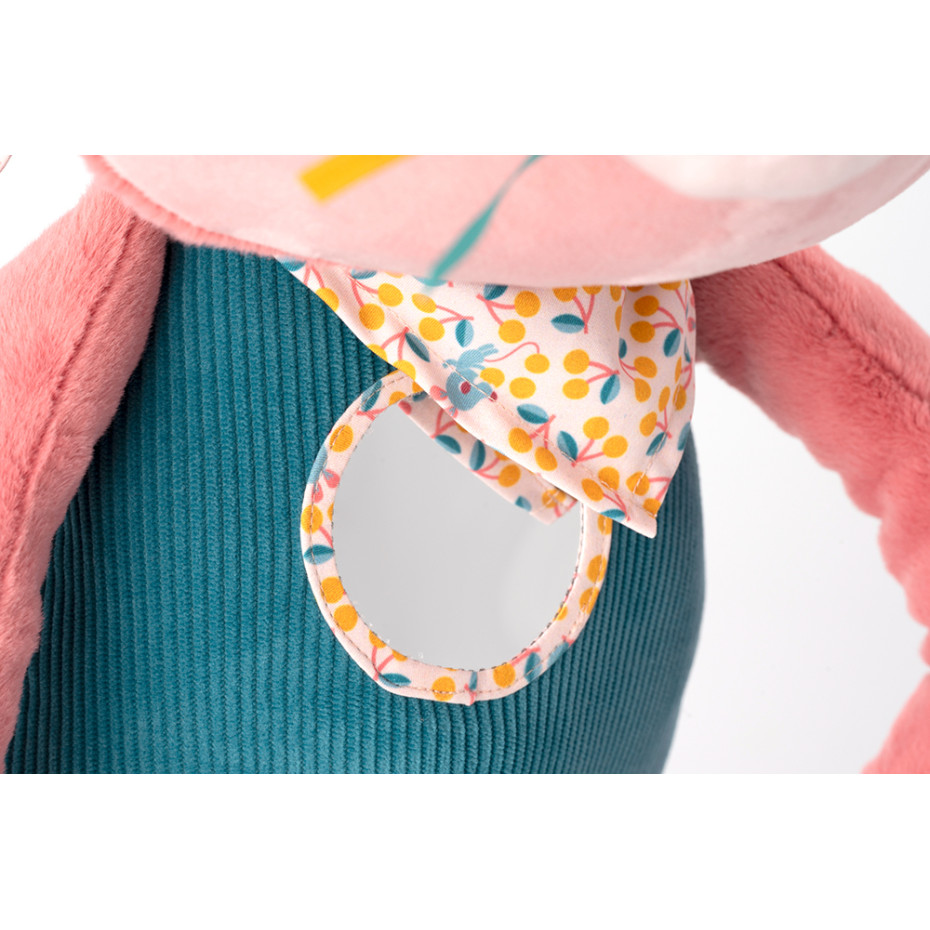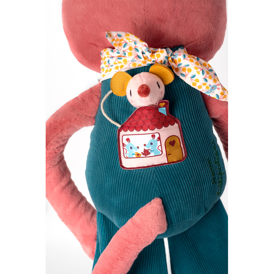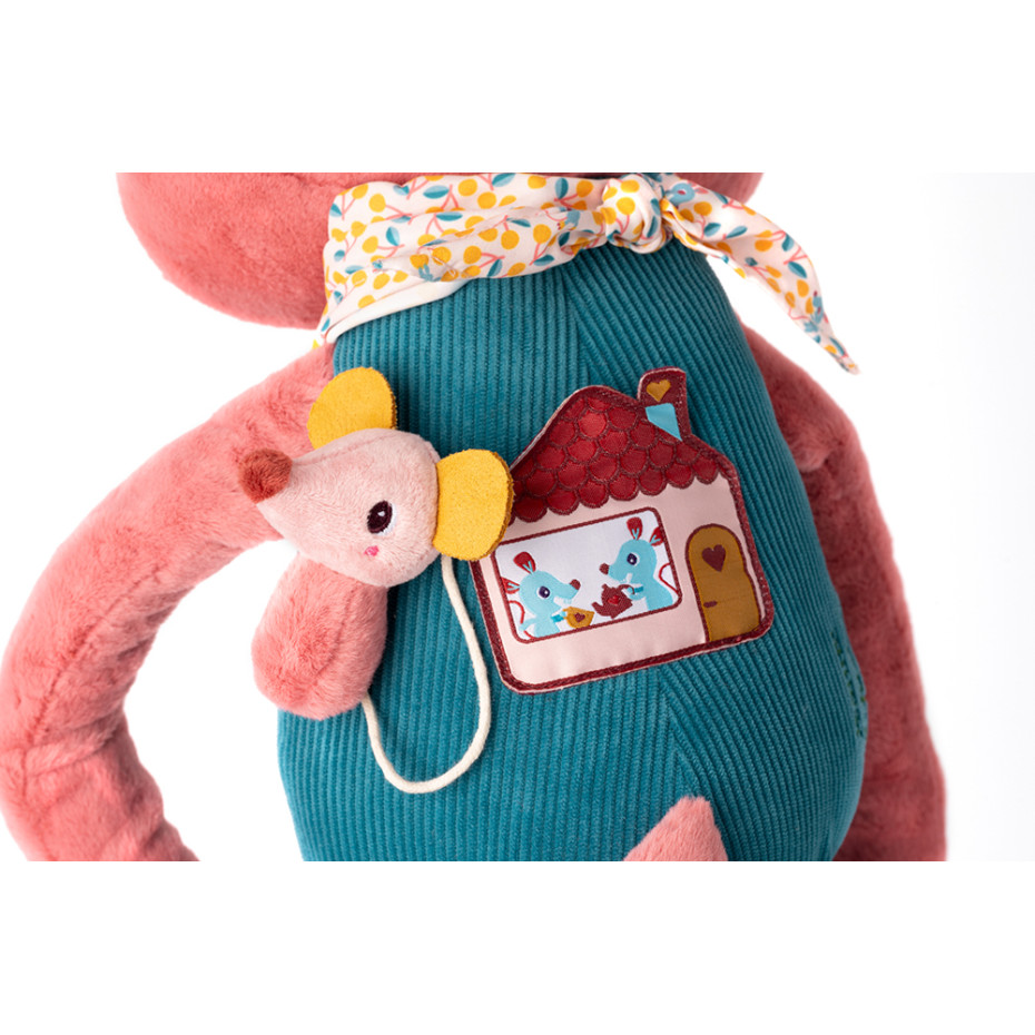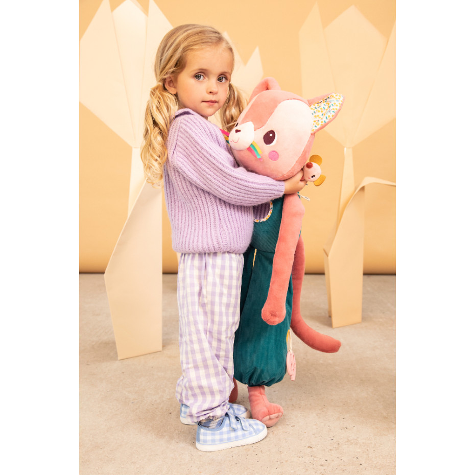 Avec son style décontracté, toujours accompagnée de ses amies les souris, voici Jeanne : la jardinière de la joyeuse bande Lilliputiens. Cette maxi peluche chat de 87 cm propose 5 activités. Vous pouvez la proposer en décoration ou comme compagne de jeu aux plus petits dès l’âge de 6 mois. Notre félin malicieux est doté d’une poignée en guise d’oreille, pour facilement l’emporter partout ! Votre enfant ne se lassera pas de caresser la douce frimousse de Jeanne et s’installera confortablement contre elle pour de gros câlins ! De plus, la grande peluche rose dispose de nombreuses activités d’éveil comme une clochette amusante dans la tête, du papier bruissant dans une oreille, un anneau de dentition en silicone détachable avec activité de popping, ou encore un miroir rond pour s’admirer. Enfin, Jeanne est accompagnée d’une souris en peluche à faire tinter joyeusement. Elle aime quitter la maison pour suivre le chat au jardin, mais rentre toujours à l’heure pour le goûter ! En plus de joliment décorer la chambre de votre bambin et d’être toujours disponible pour les câlins ; cette peluche géante lui permet de développer son acuité visuelle et auditive, et favorise la découverte tactile grâce aux nombreuses activités à explorer. Avec ses détails bucoliques, ses couleurs apaisantes, ses matières riches et agréables, et ses nombreuses activités, la peluche Découvertes Jeanne le chat égayera la déco de chambre de votre enfant, qui ne manquera pas de la câliner. On adore son pantalon baggy, son bandana, ses longues jambes et ses moustaches colorées ! Ce jouet d’activités se lave facilement en machine à 30° après avoir retiré la feuille en silicone. Égayez dès maintenant l’espace jeu de votre petit bout !