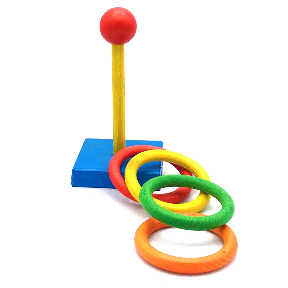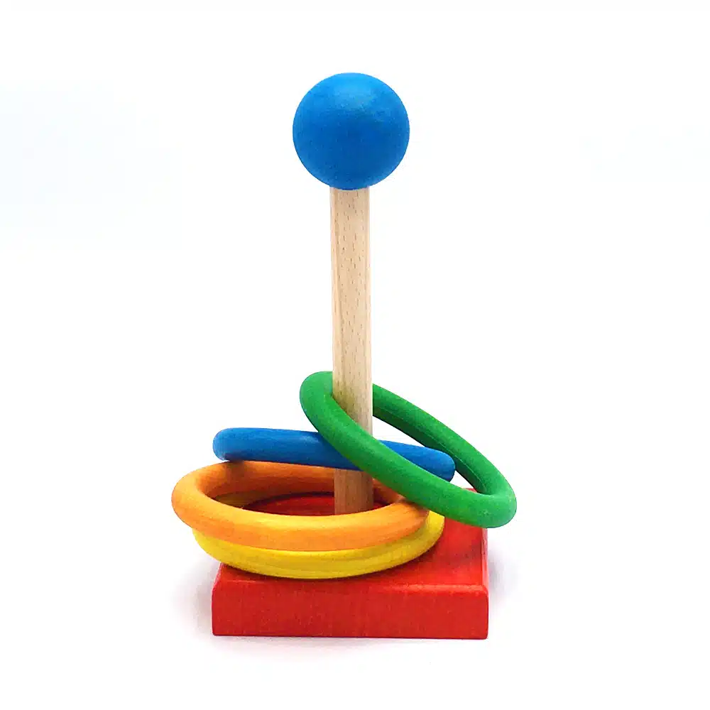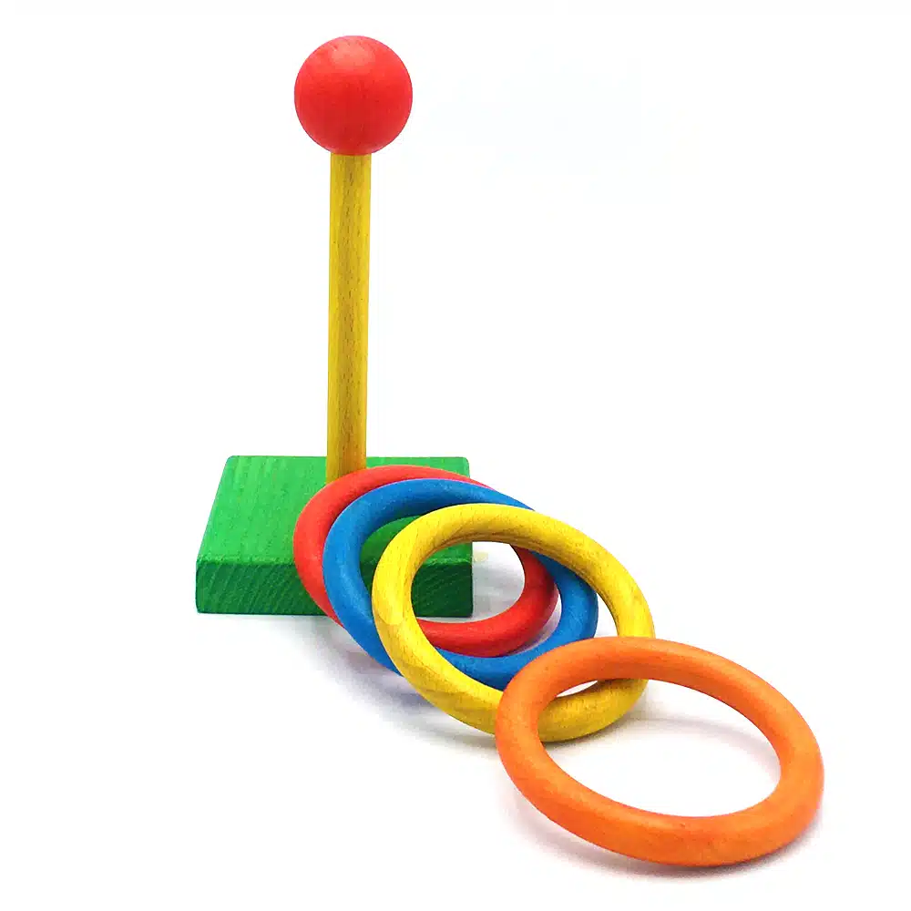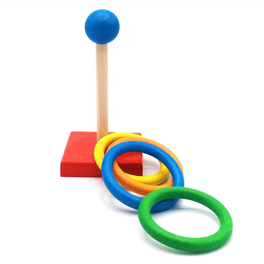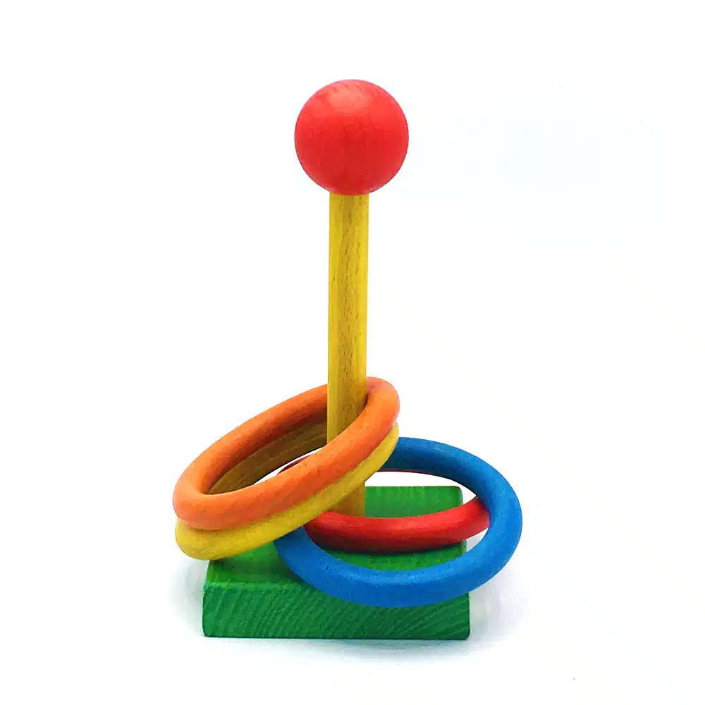 Jeu de lancer d’anneaux en bois, fabriqué par nos artisans du Jura en France. À partir de 3 ans.