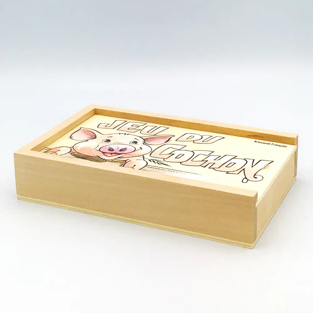 Pour 2 joueurs, 2 puzzles en peuplier représentant un cochon avec 2 dés et une notice rangé dans une jolie boîte en tilleul.